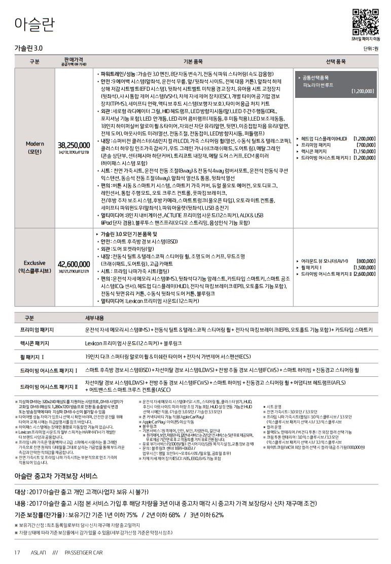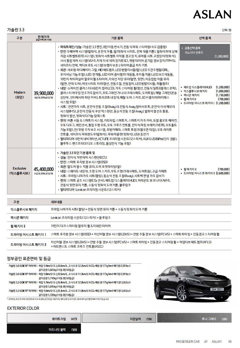 ◆ 2017 아슬란 가격표 옵션표 ◆