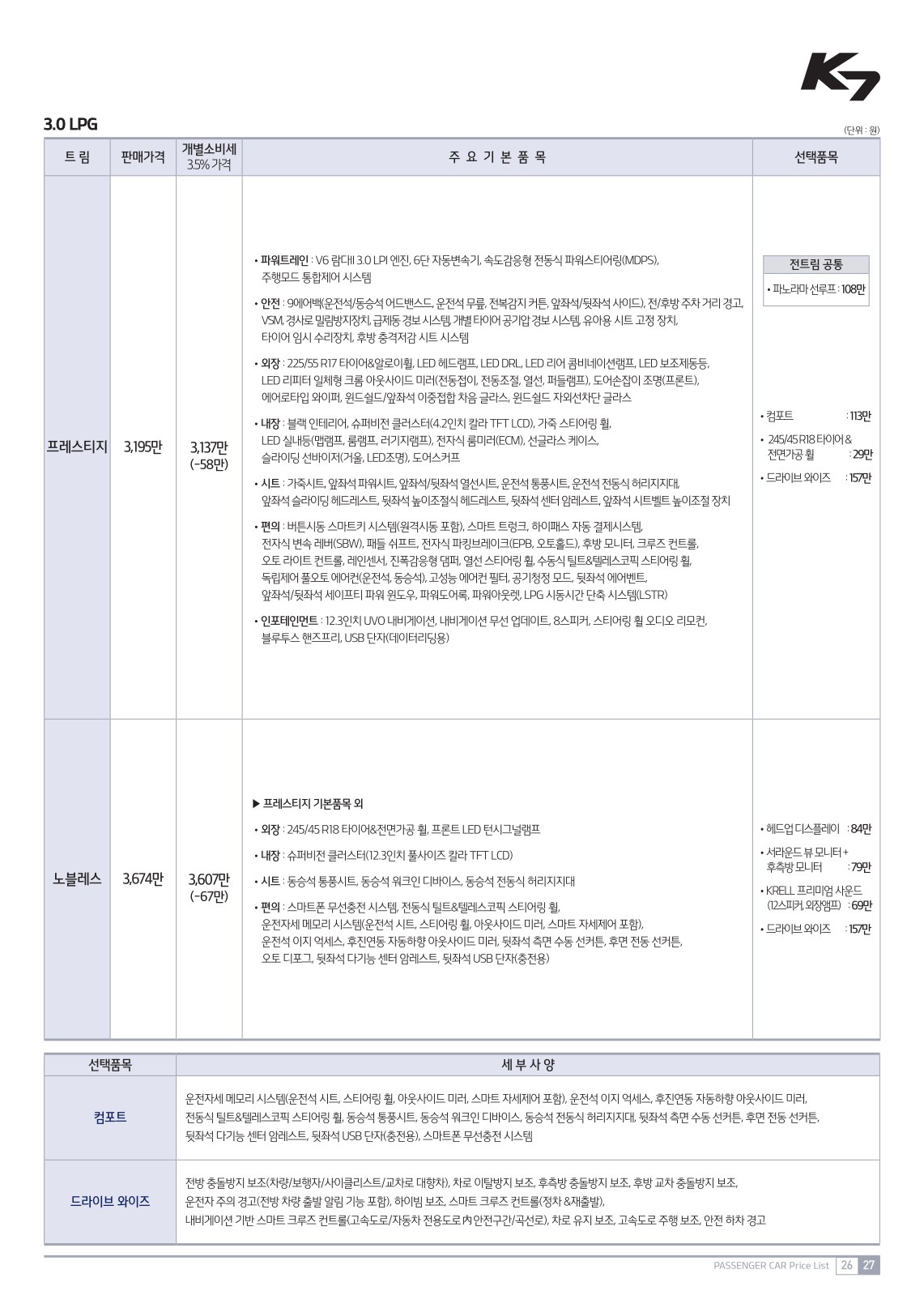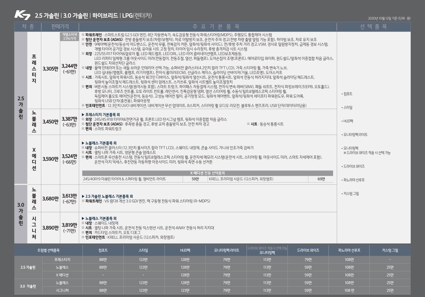 - 2021 K7 가격표 옵션표 -
