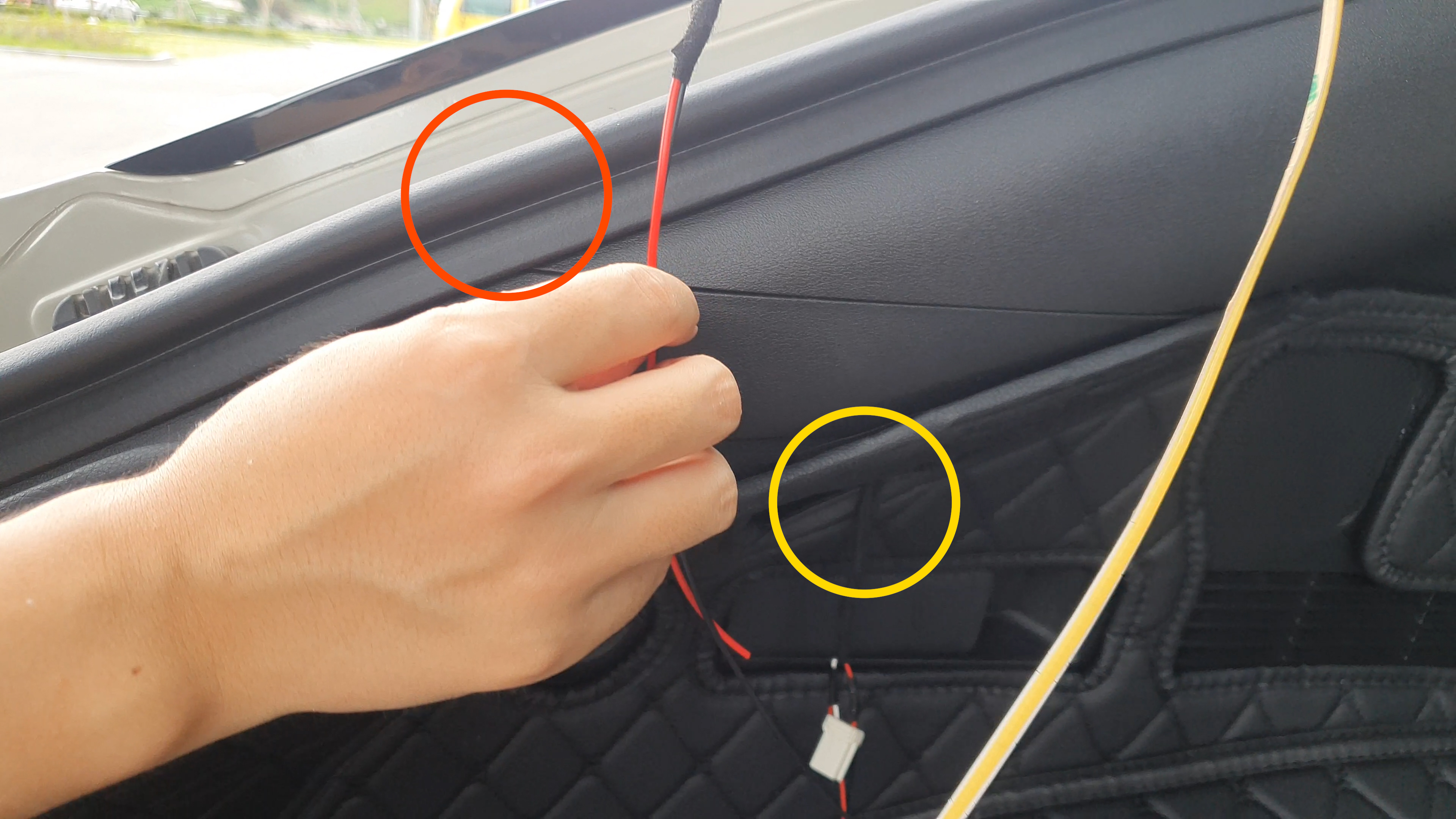 이제 LED바 선을 플라스틱트림과 철판 사이(빨간색원)로 넣어서