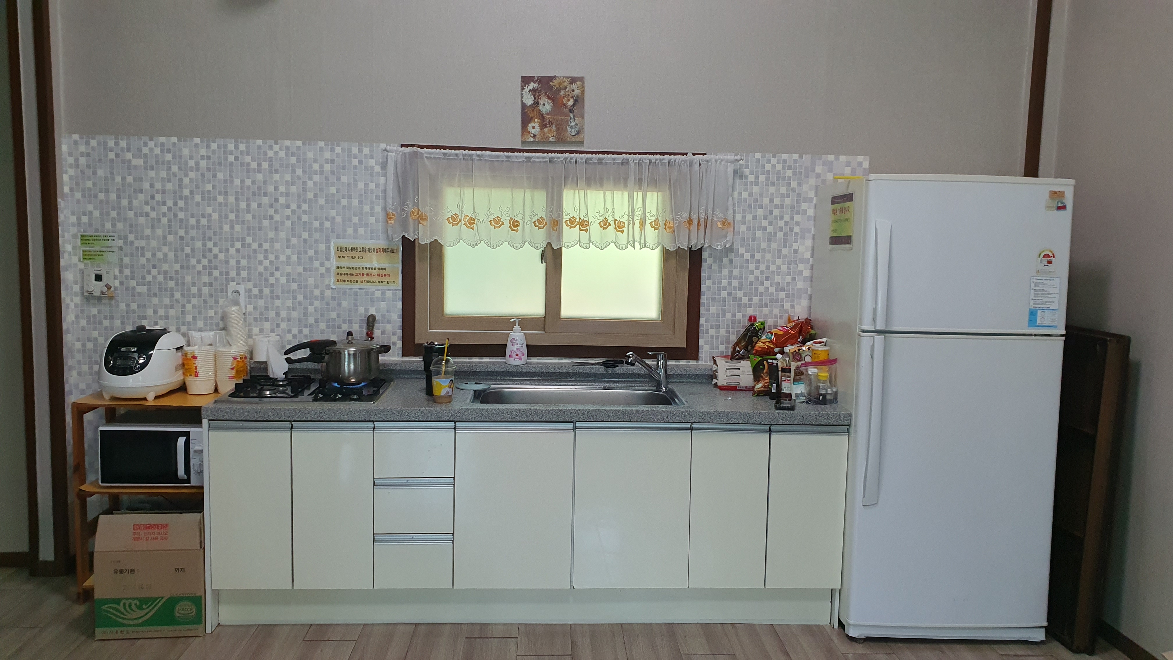 주방에는 전자레인지, 가스레인지, 전기밥솥, 냉장고 등이 있고
