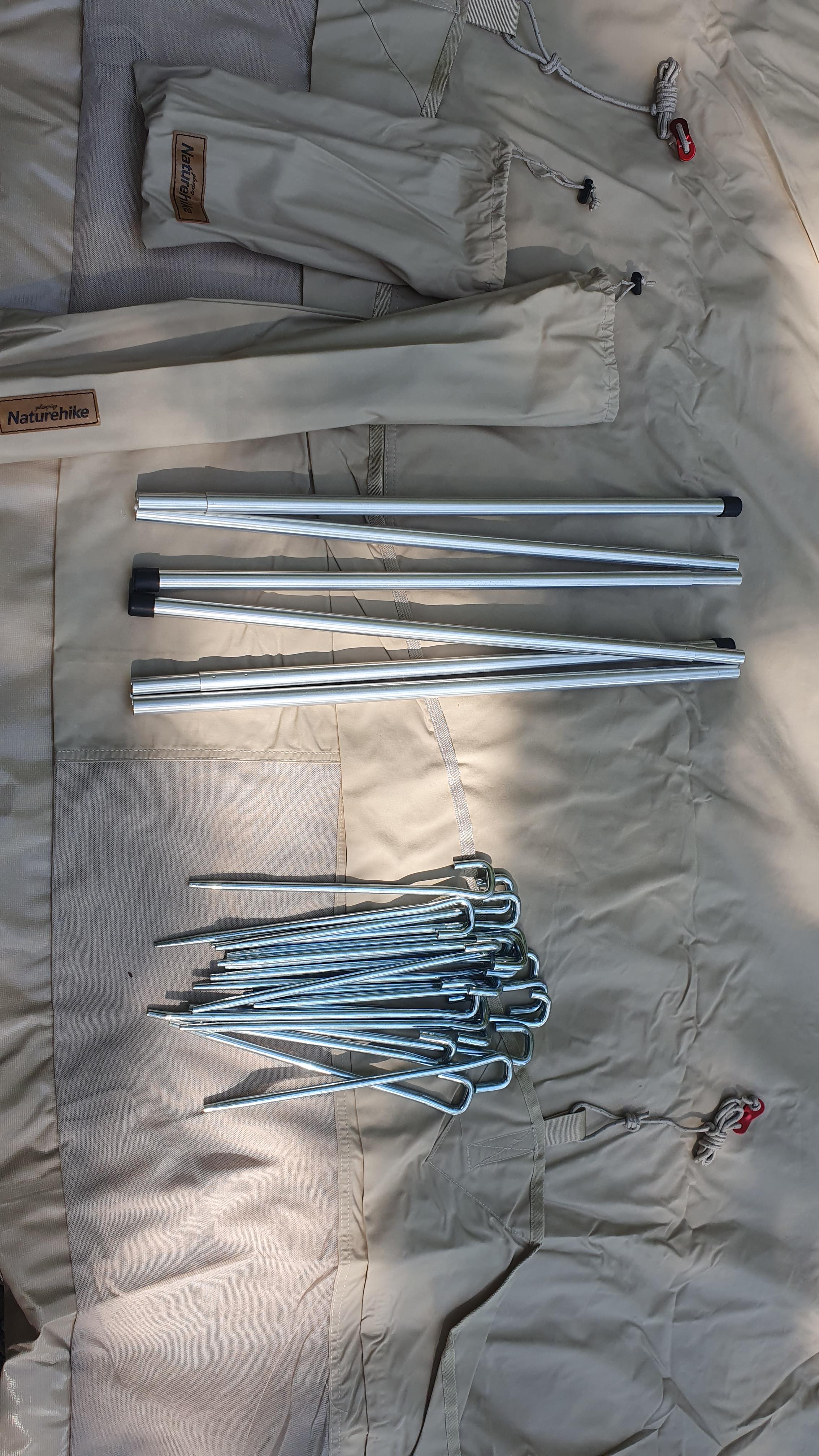 텐트본품, 폴대2개, 스테인레스 팩20개가 들어있습니다