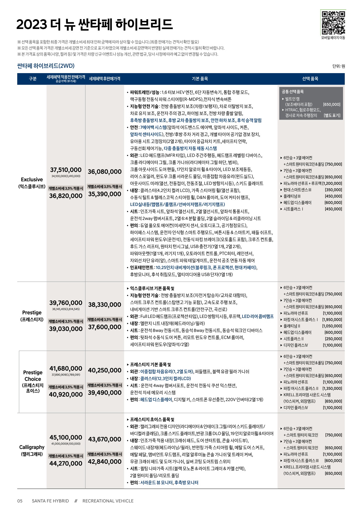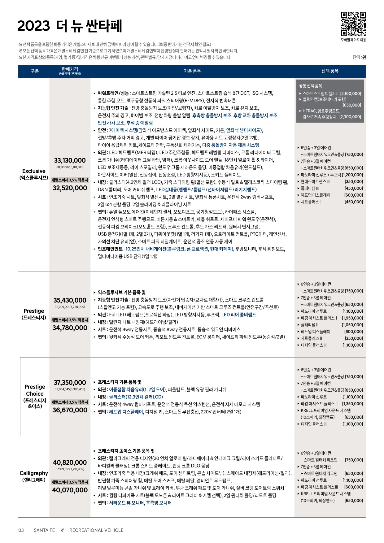 - 2023 더 뉴 싼타페 가격표 옵션표 -