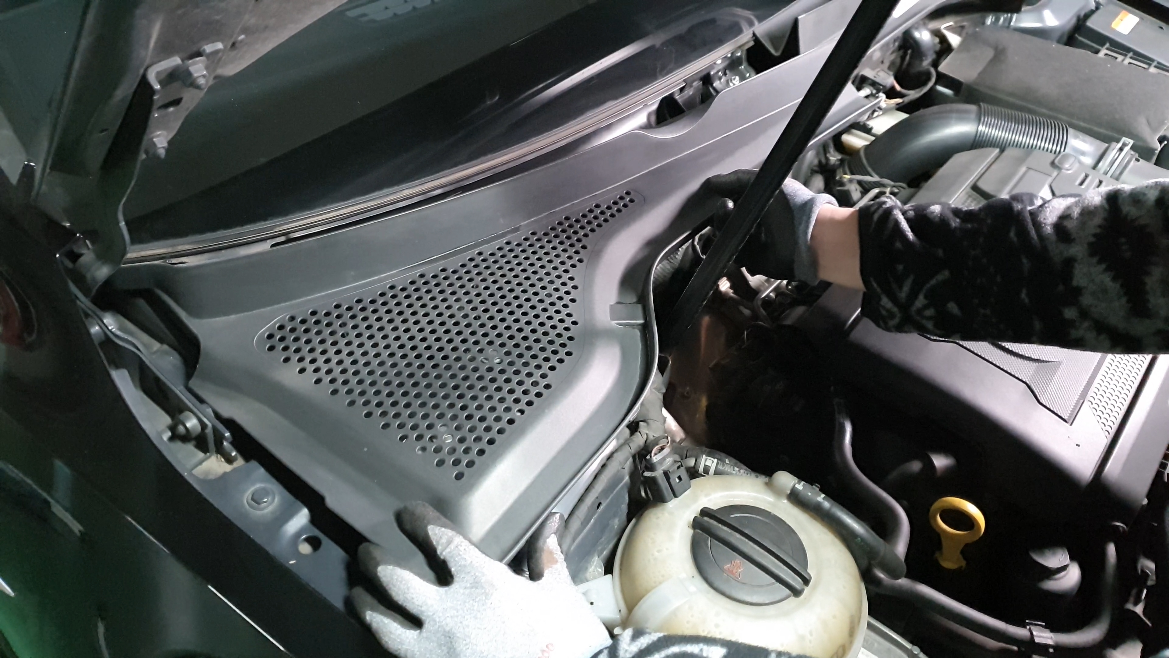 본넷 안쪽에 조수석쪽을 보면 외부공기가 흡입될 수 있는 곳이 있습니다