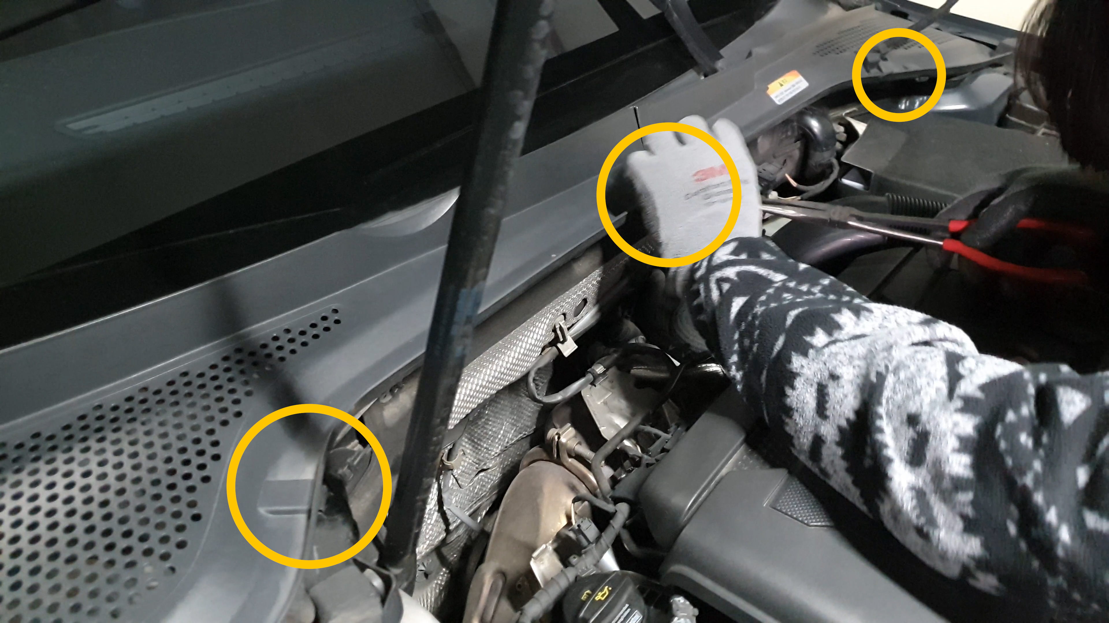 본넷을 열면 노란색 동그라미 아래쪽에 외부공기 유입구가 있습니다