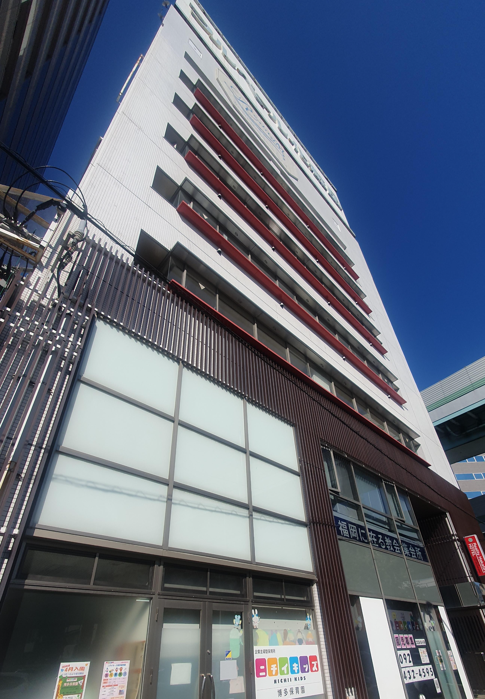 하카타 역쪽에서 다리하나를 건너면 이렇게 생긴 건물이 보이고 빨간색 간판도 보입니다