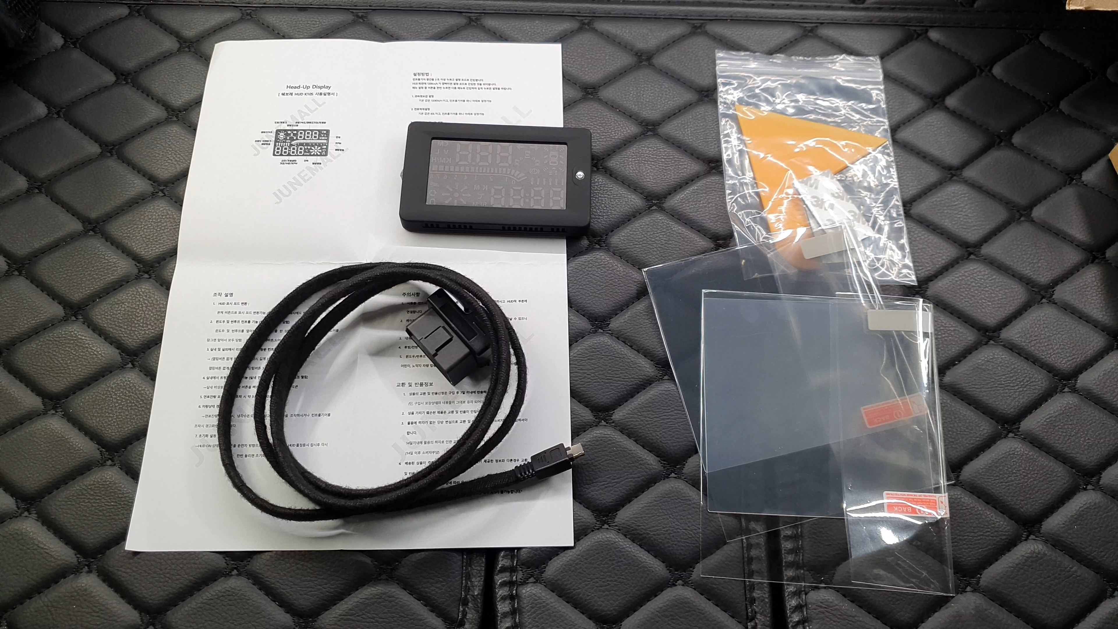 구성품은 HUD 본체 / 설명서 / OBD단자 연결케이블 / 반사필름 / 헤라