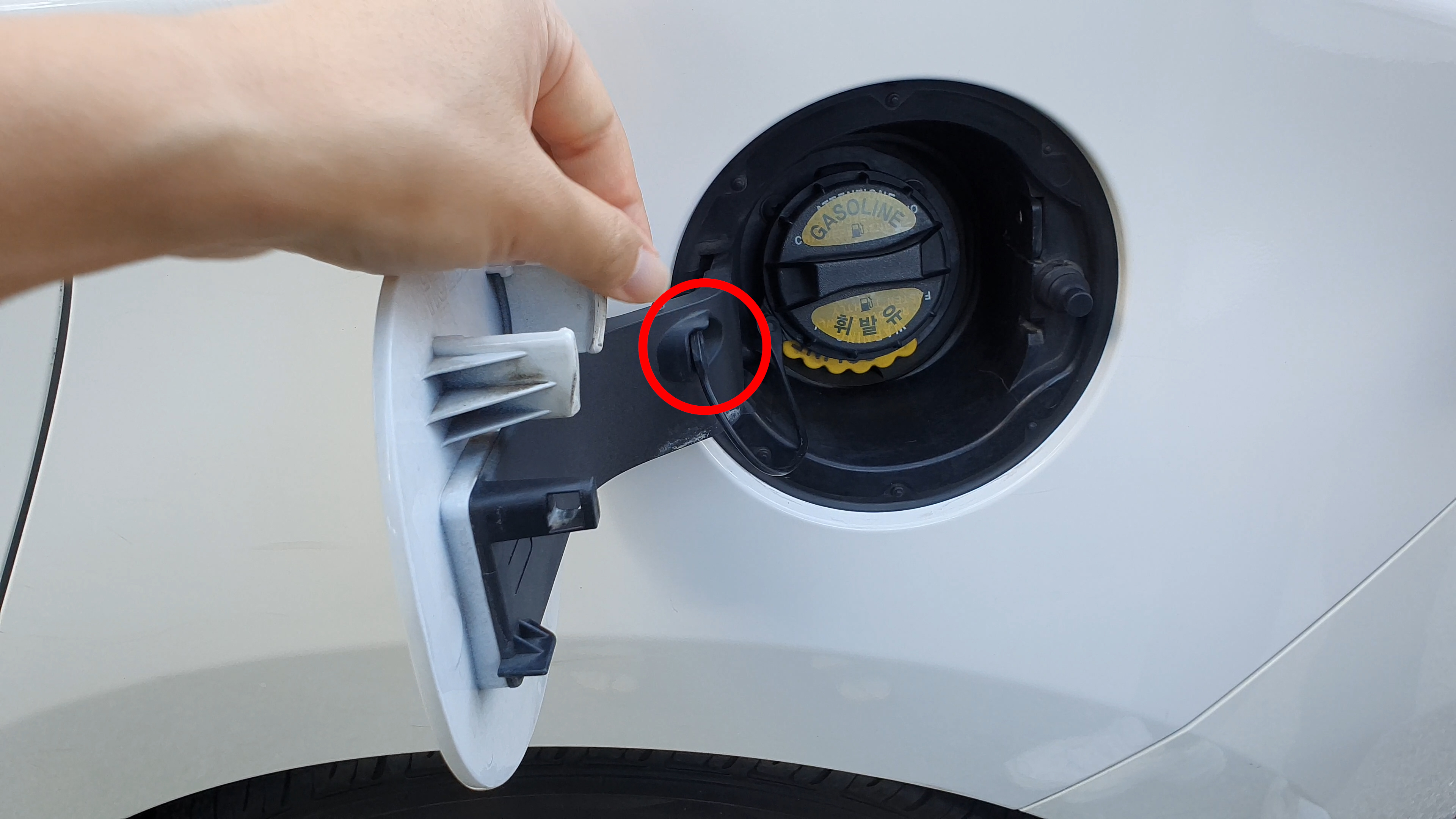우선 주유구를 열고 빨간색 원으로 표시된곳의 고정선? 을 당겨서 제거해줍니다.