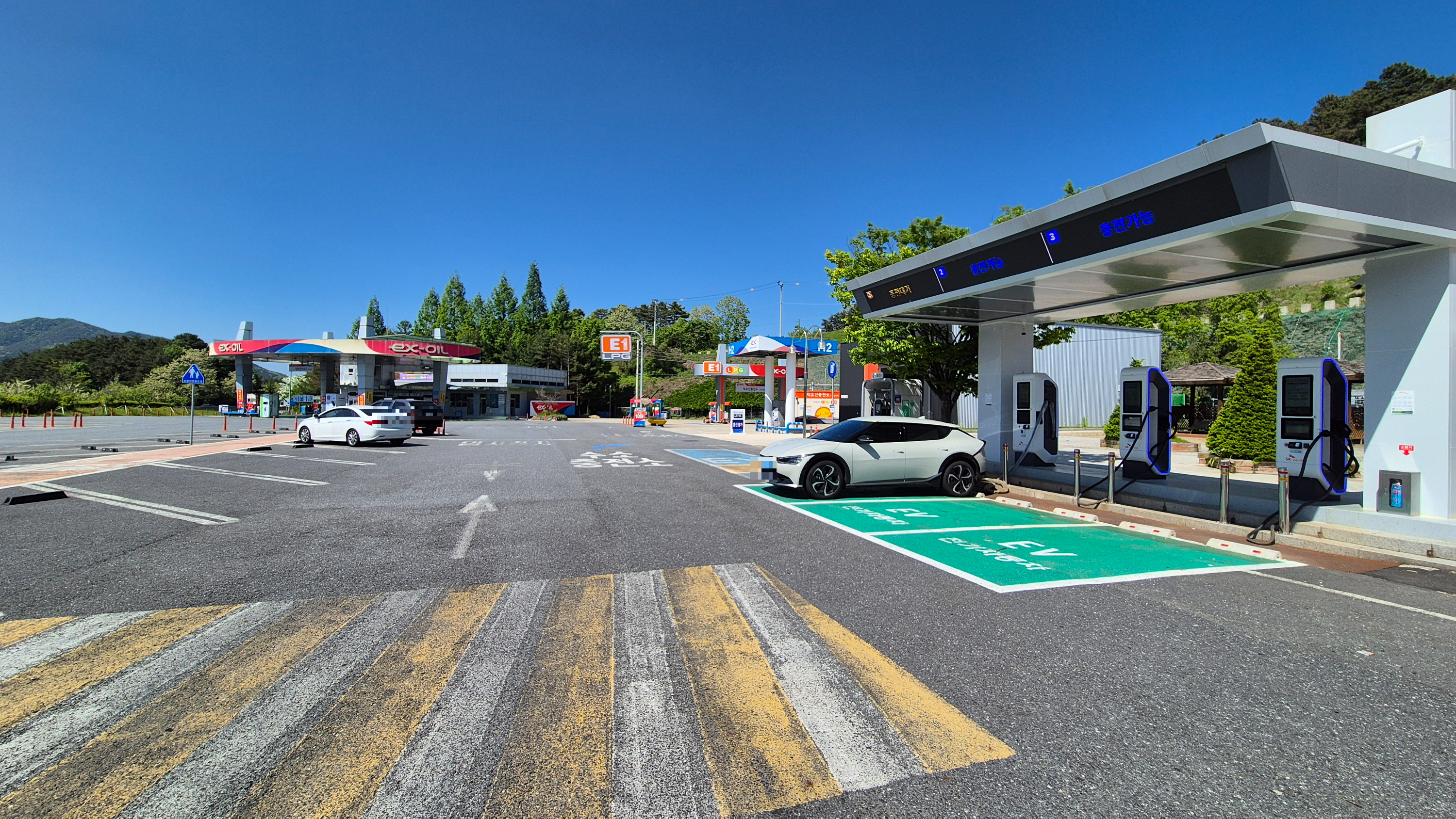 전기차충전소는 휴게소 출구쪽에 주유소와 LPG충전소, 수소충전소와 같이 있습니다