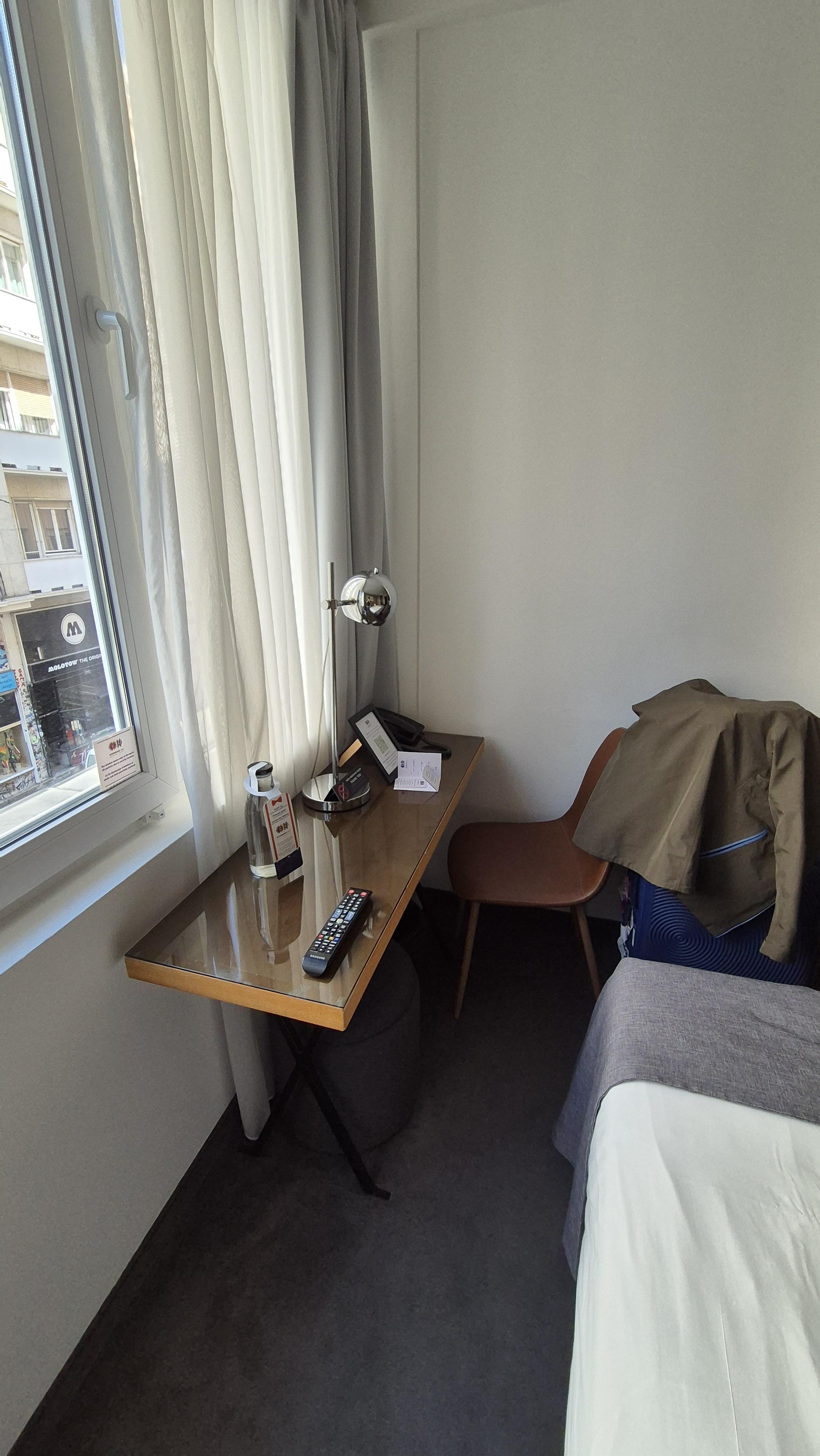 창문 밖을 내다보면 이런풍경이구요 창문 옆쪽으로는 의자 1개와 테이블이 있습니다