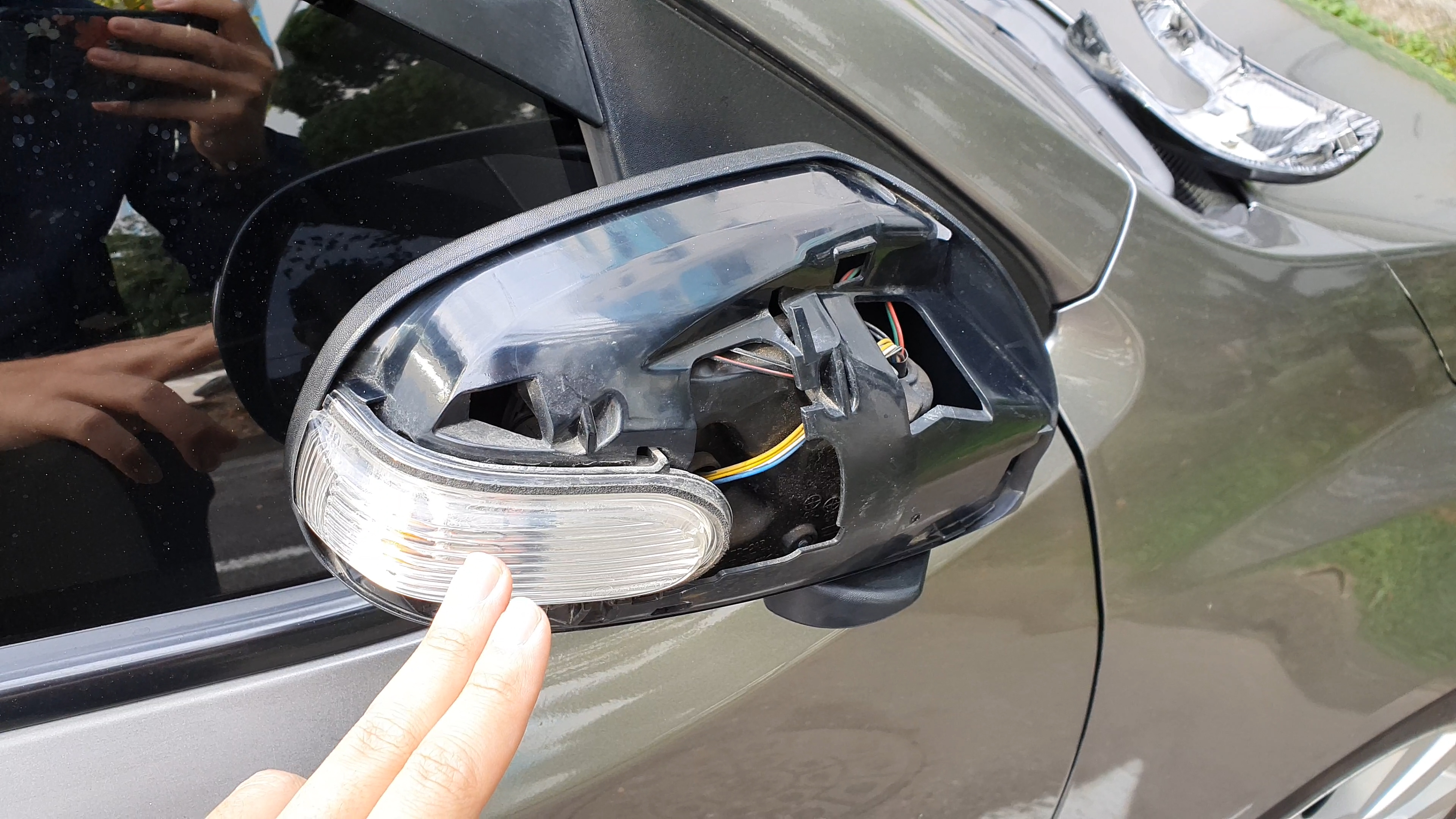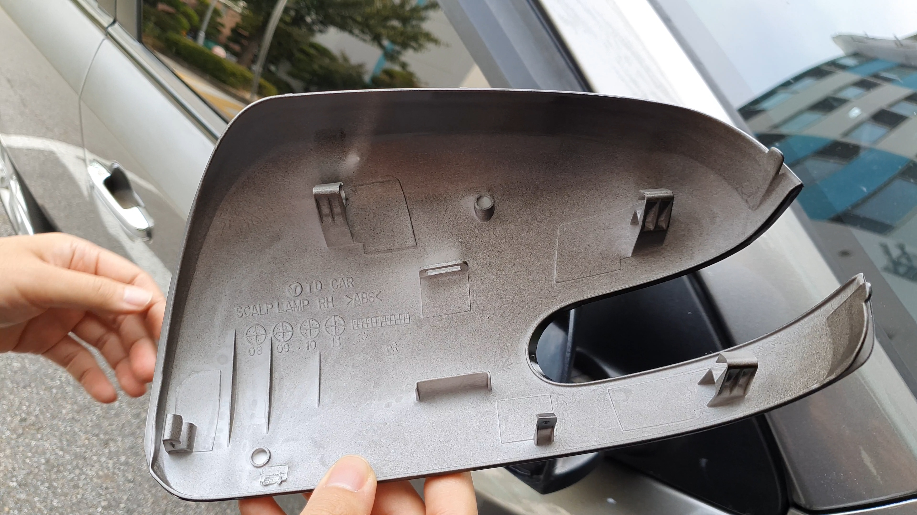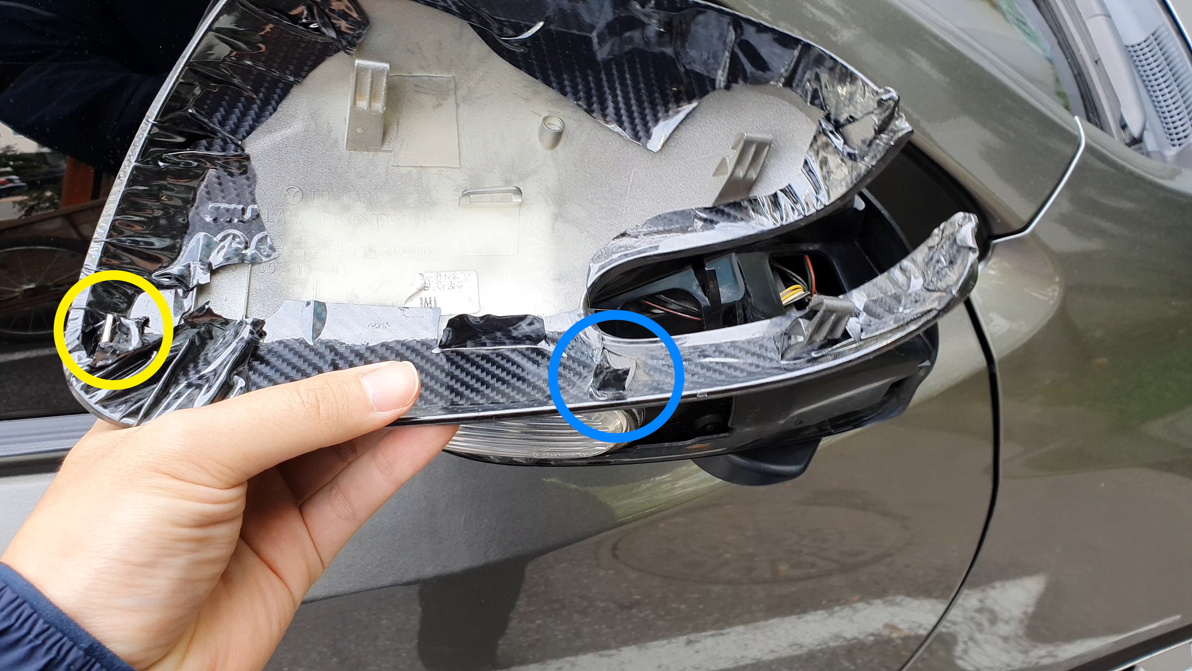 탈거된 사이드미러 커버를 보면 노란색부분이 랩핑을 할때 부러진부분이고