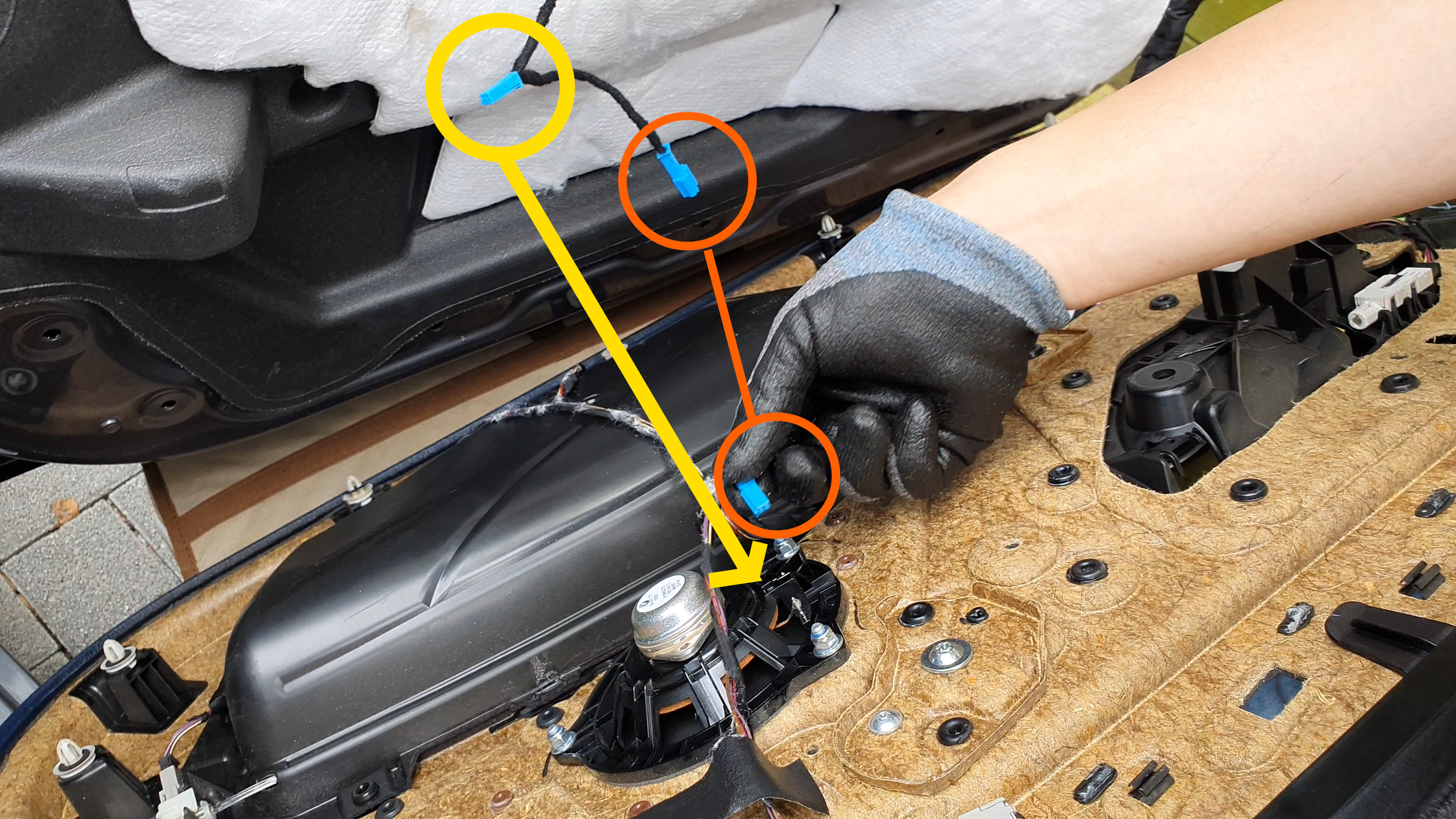 새로운 트위터에 연결되어있는 수 커넥터를 도어트림에 연결해줍니다 (노란색처럼)