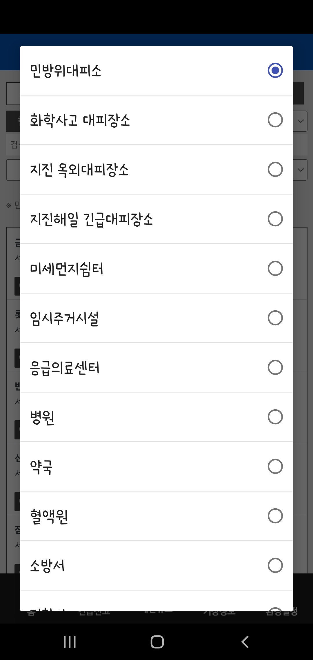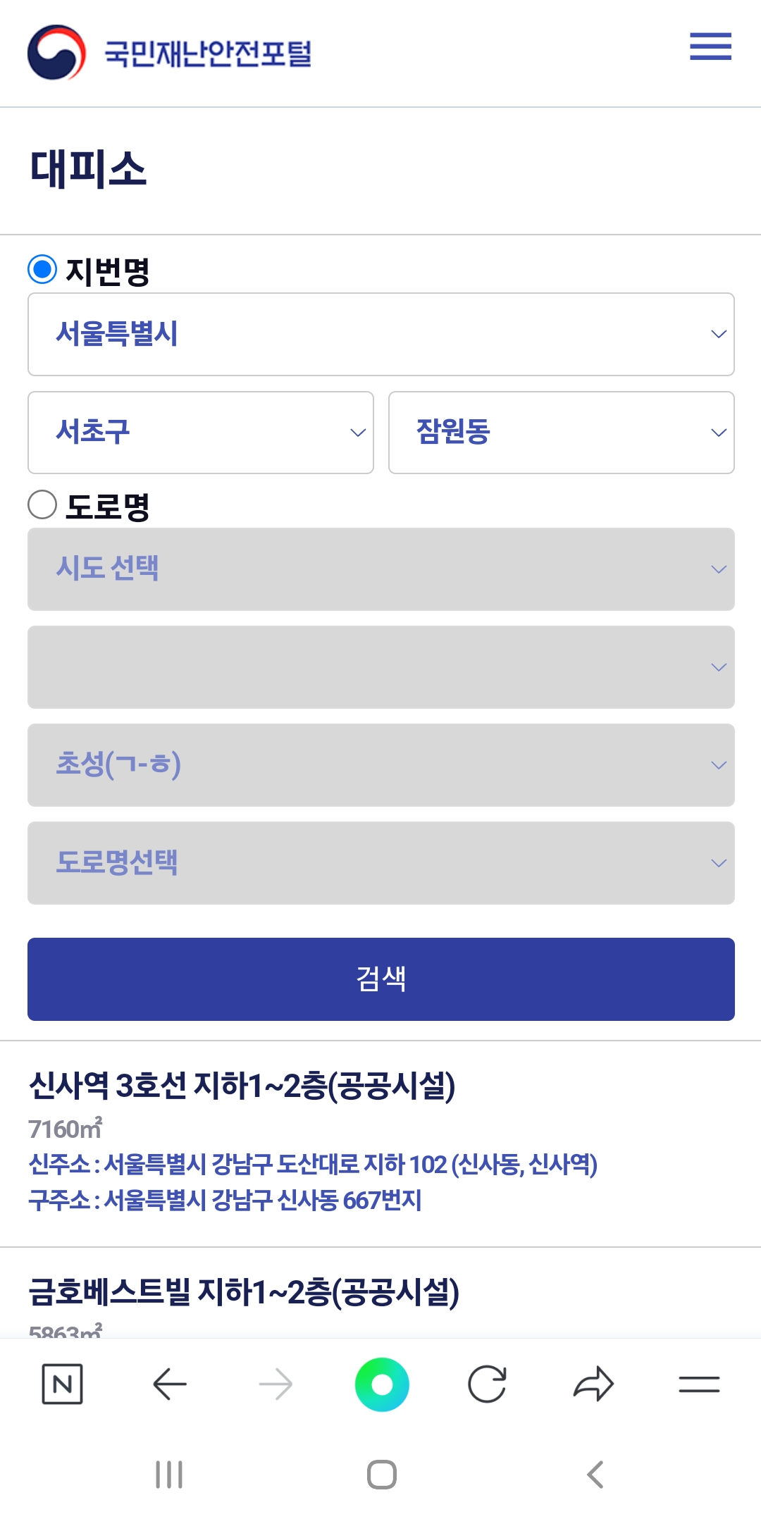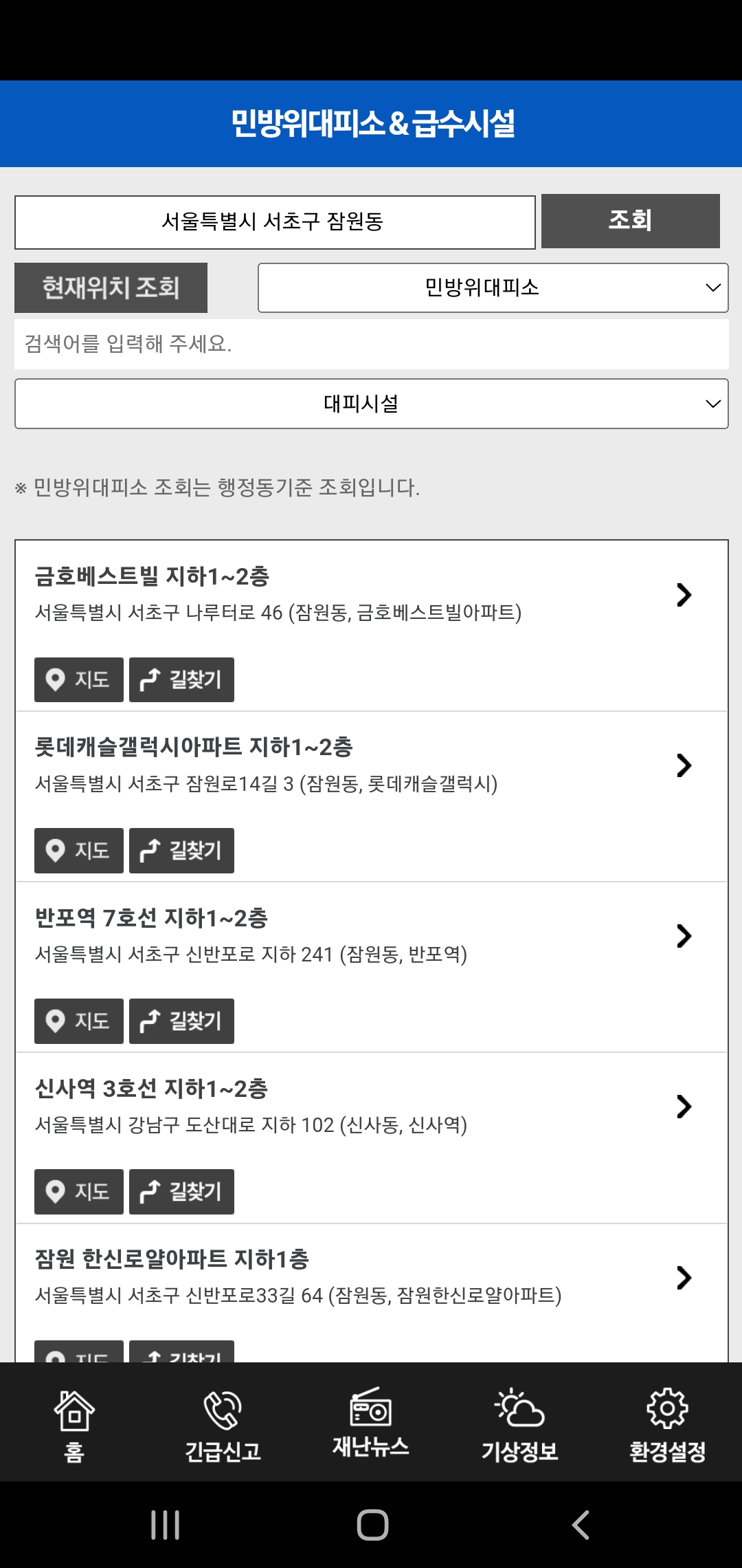 대피소 조회버튼을 클릭하여 대피소가 어디있는지 알 수 있습니다