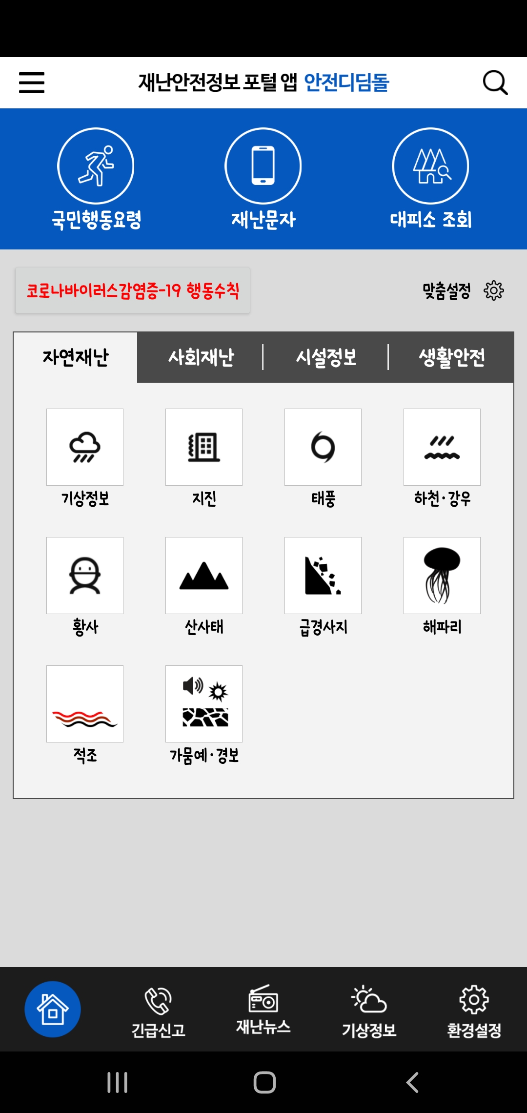 어플에 들어가니 다양한 재난안전에 관한 사항들이 나와있으며