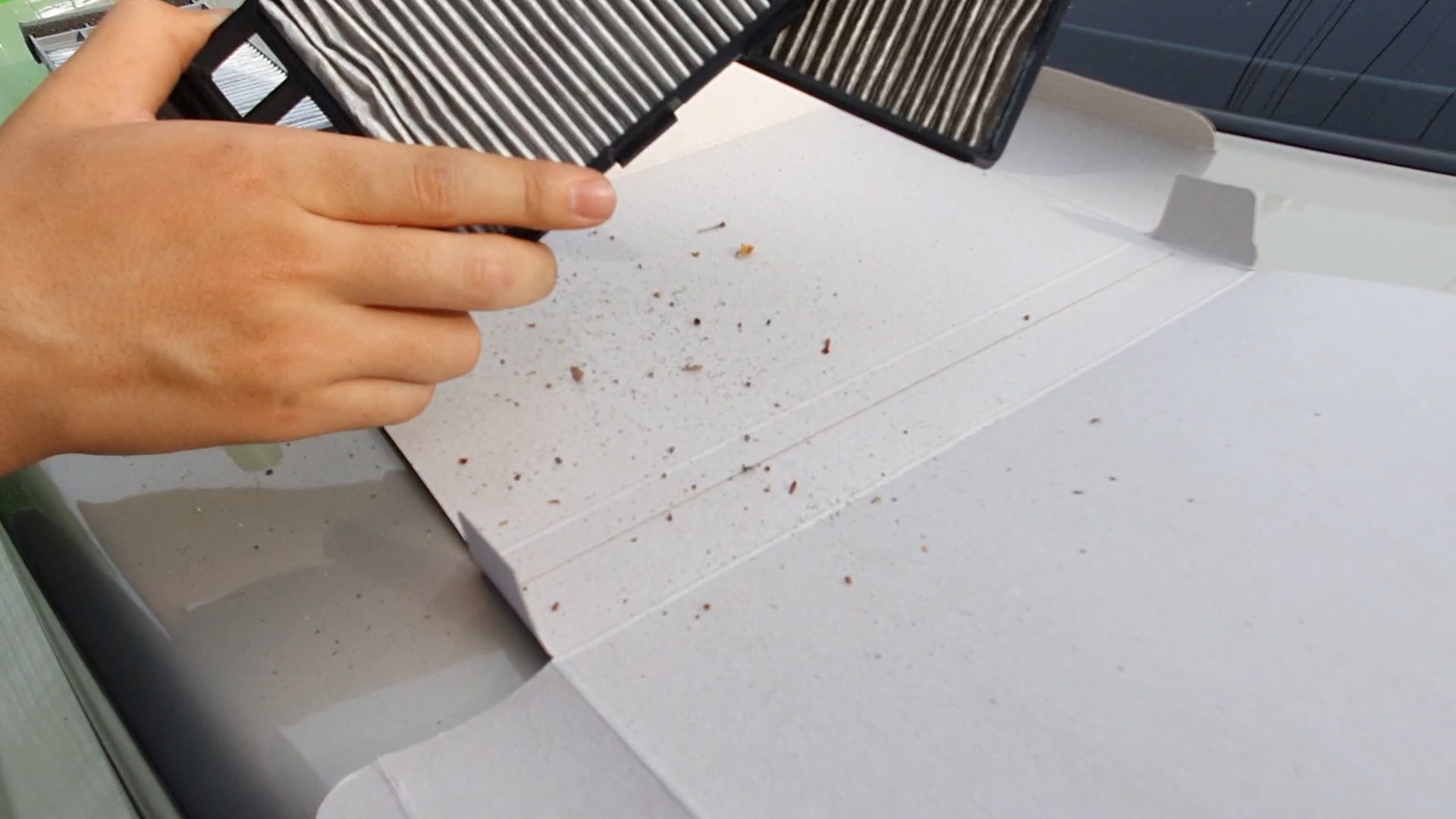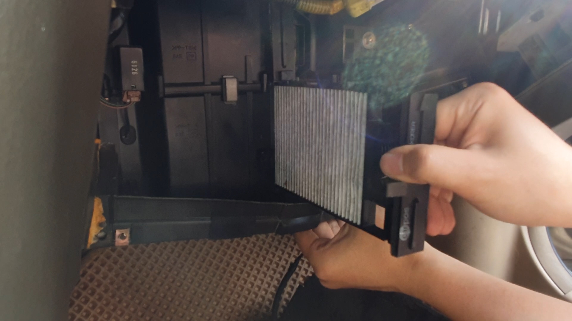 저부분을 휘어주면서 아래쪽 에어컨필터를 빼보겠습니다.