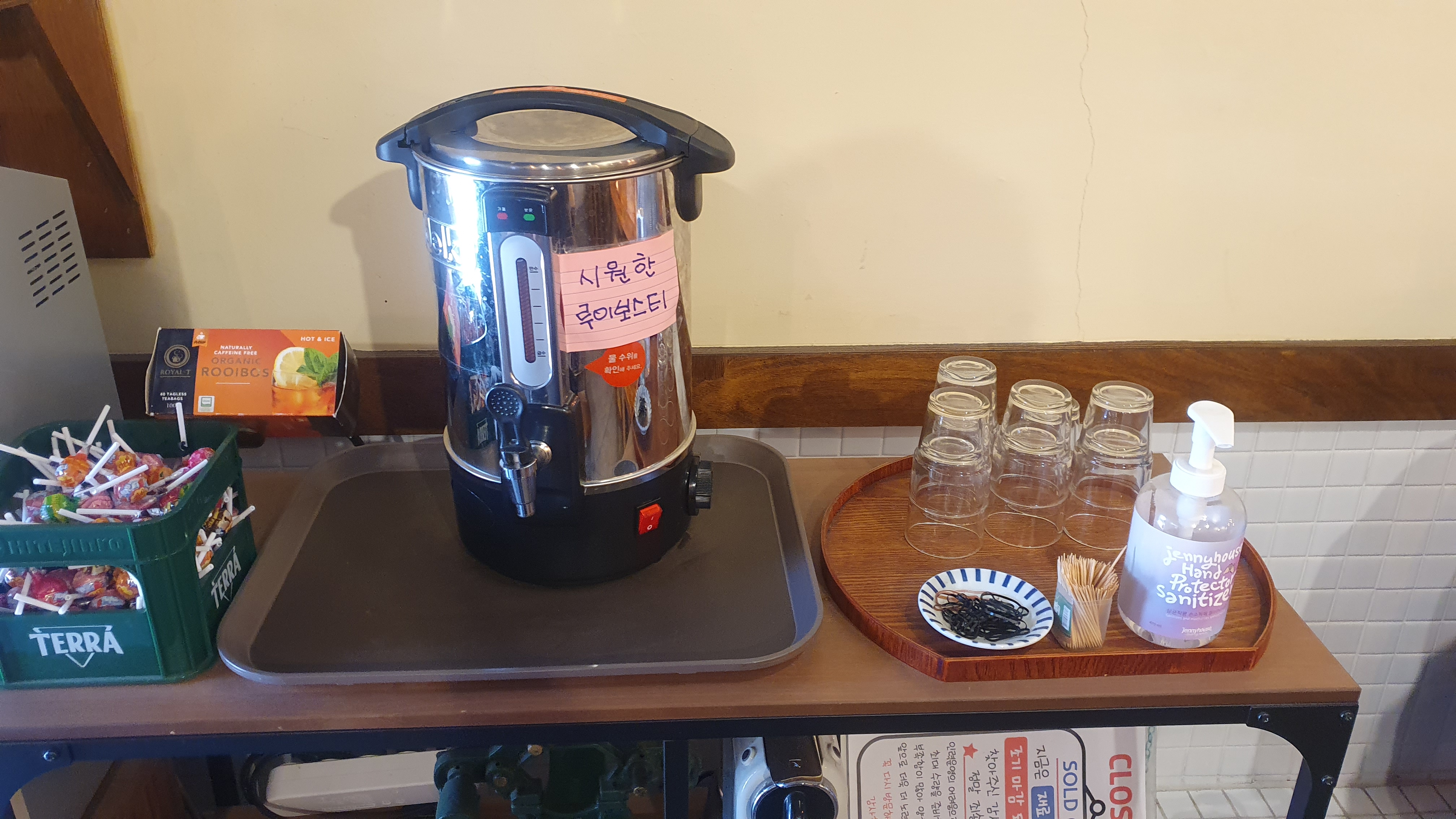 키오스크 옆에는 티와 사탕이 준비되어있습니다