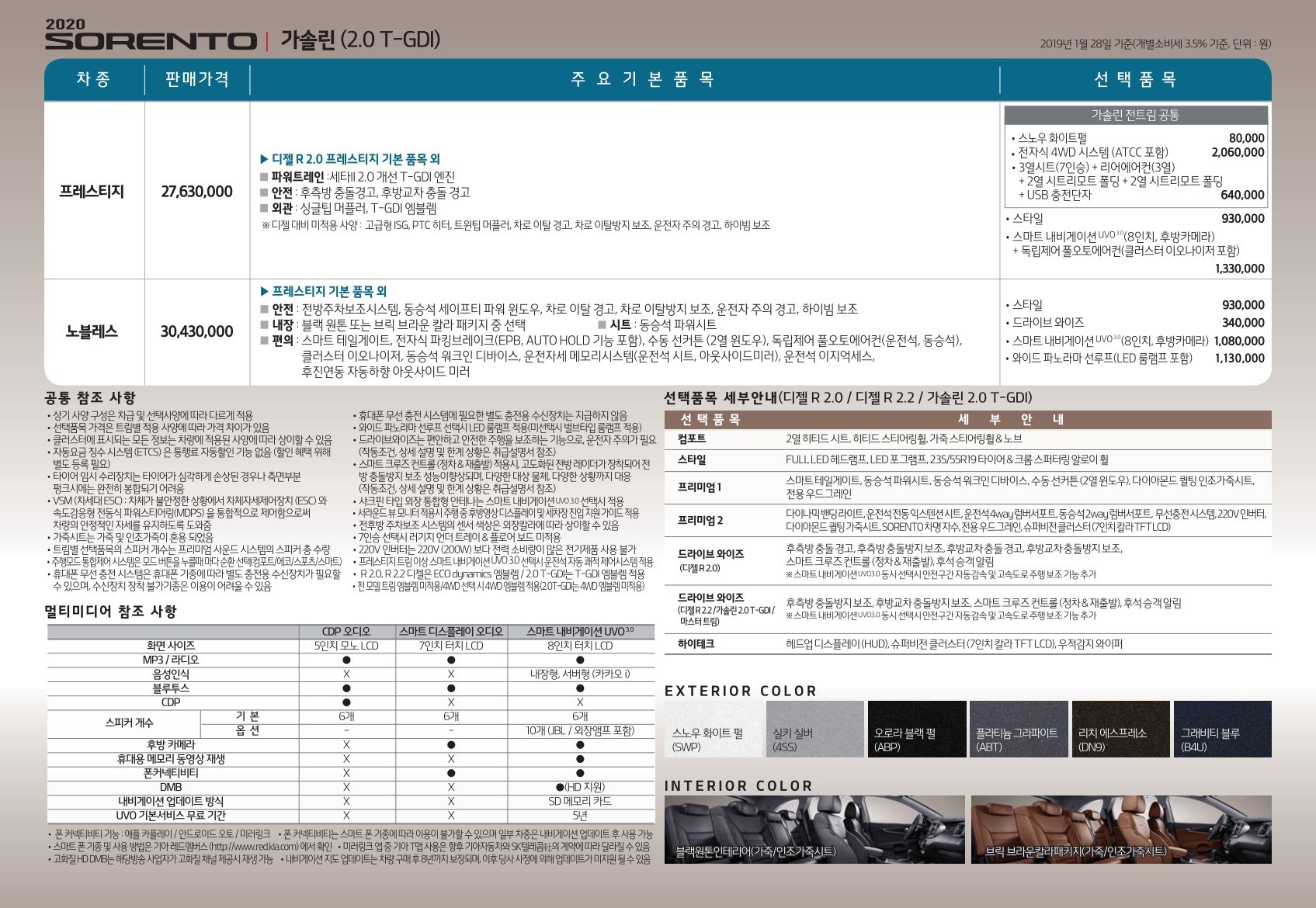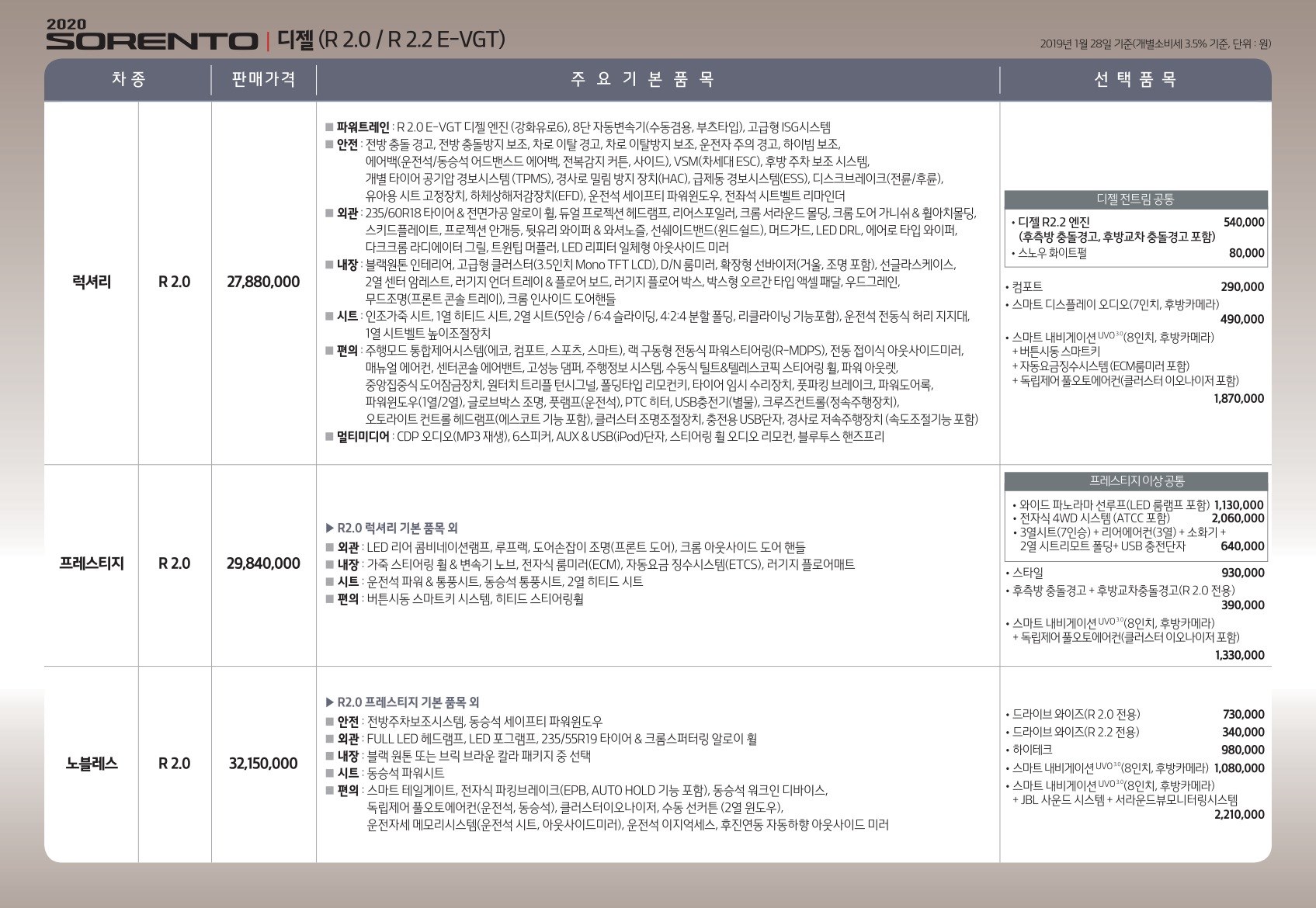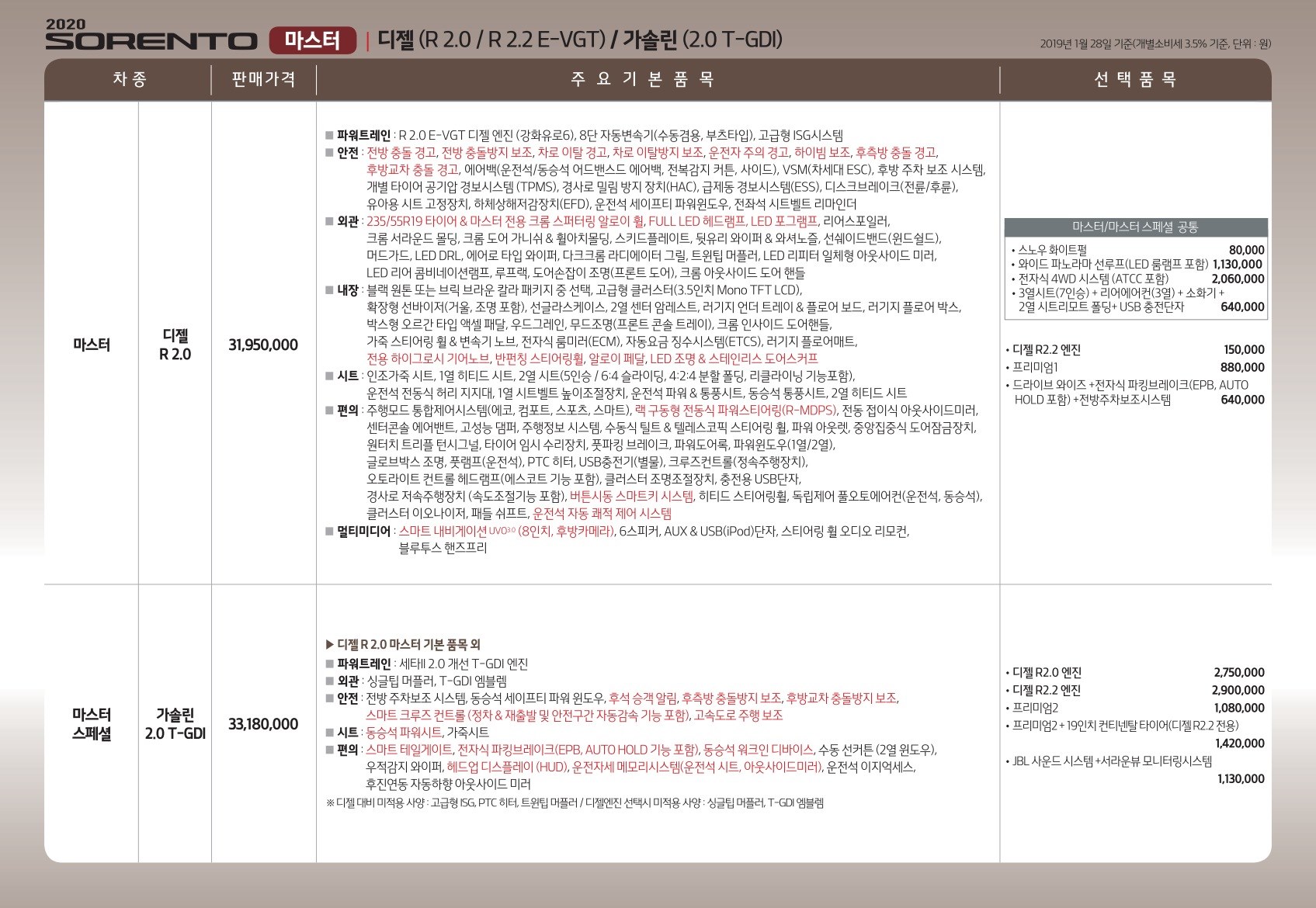 - 2019 더 뉴 쏘렌토 가격표 옵션표 -