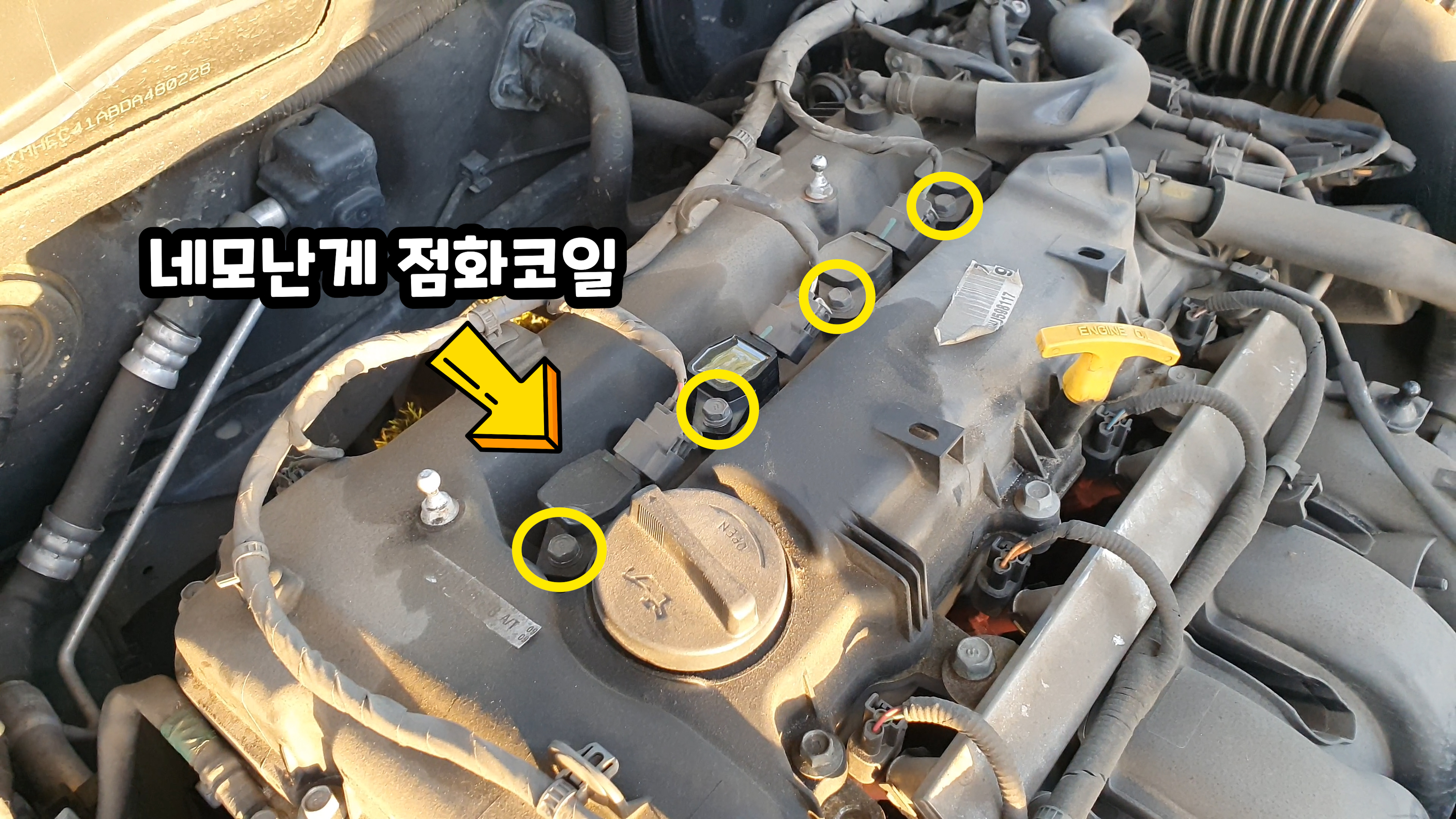 노란색화살표로 표시된 곳에 네모난게 점화코일이고 점화코일을 제거하면 안쪽에 점화플러그가 있습니다