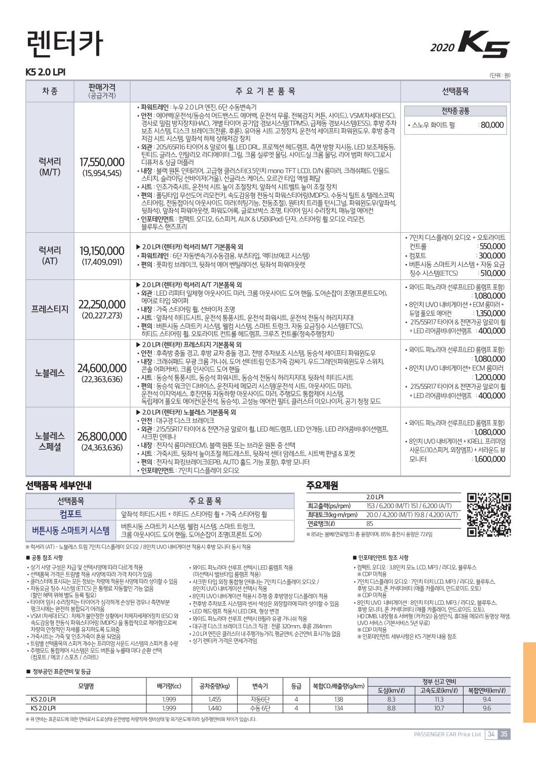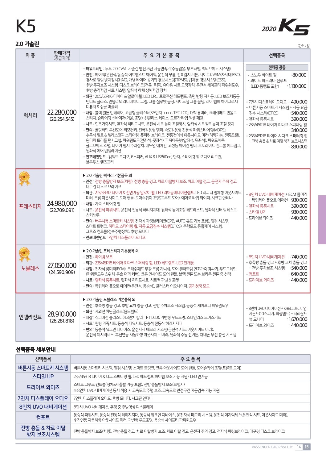 - 2020 더 뉴 K5 가격표 옵션표 -