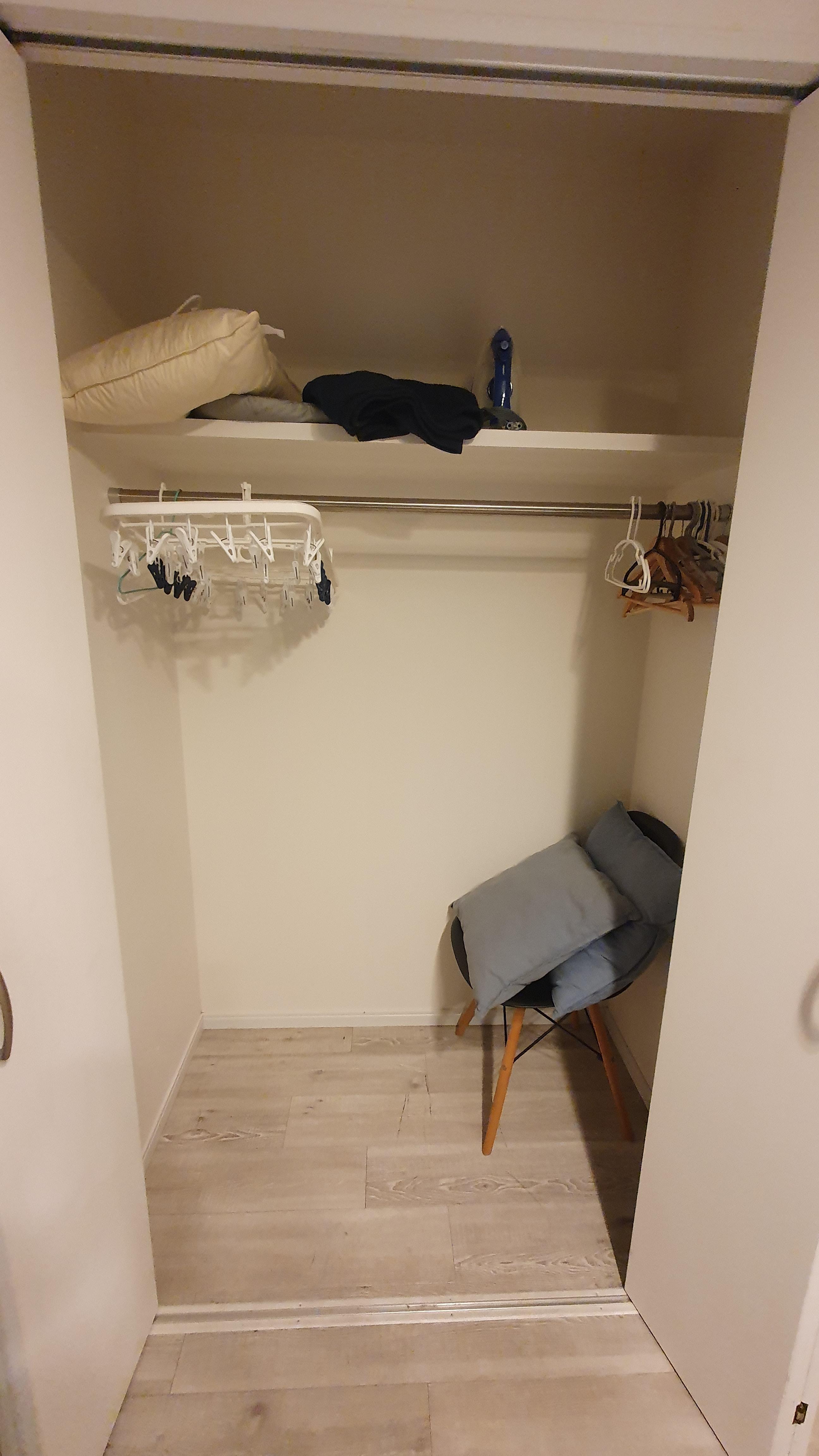 안쪽에 장을 열어보면 옷걸이와 여분의 의자가 하나 있습니다