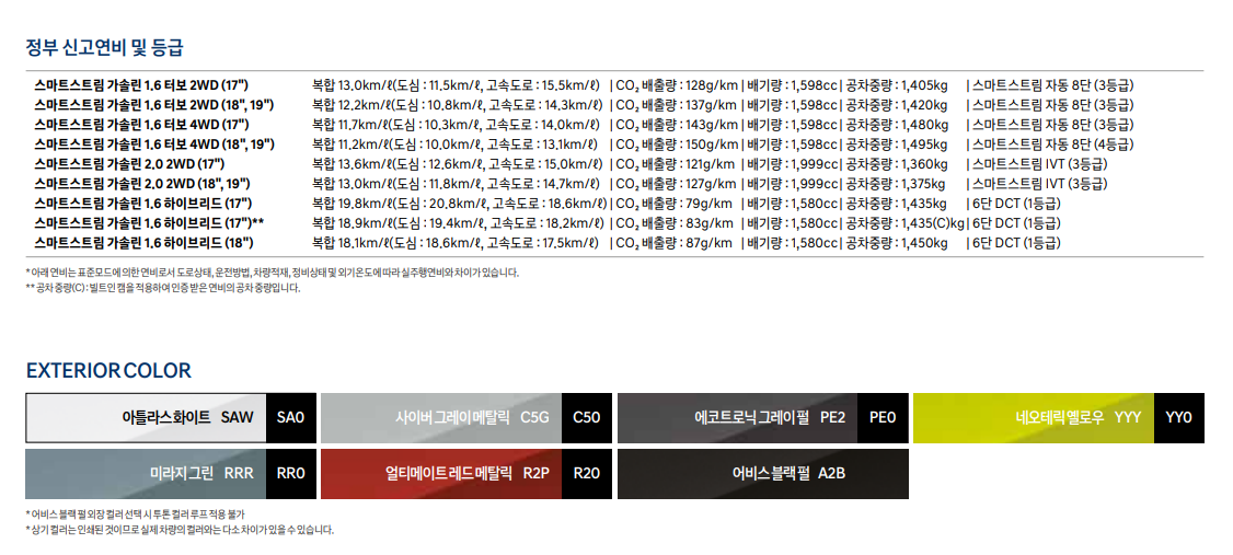 파워트레인은 가솔린 1.6T / 2.0 / 1.6하이브리드 / EV 모델이 있습니다