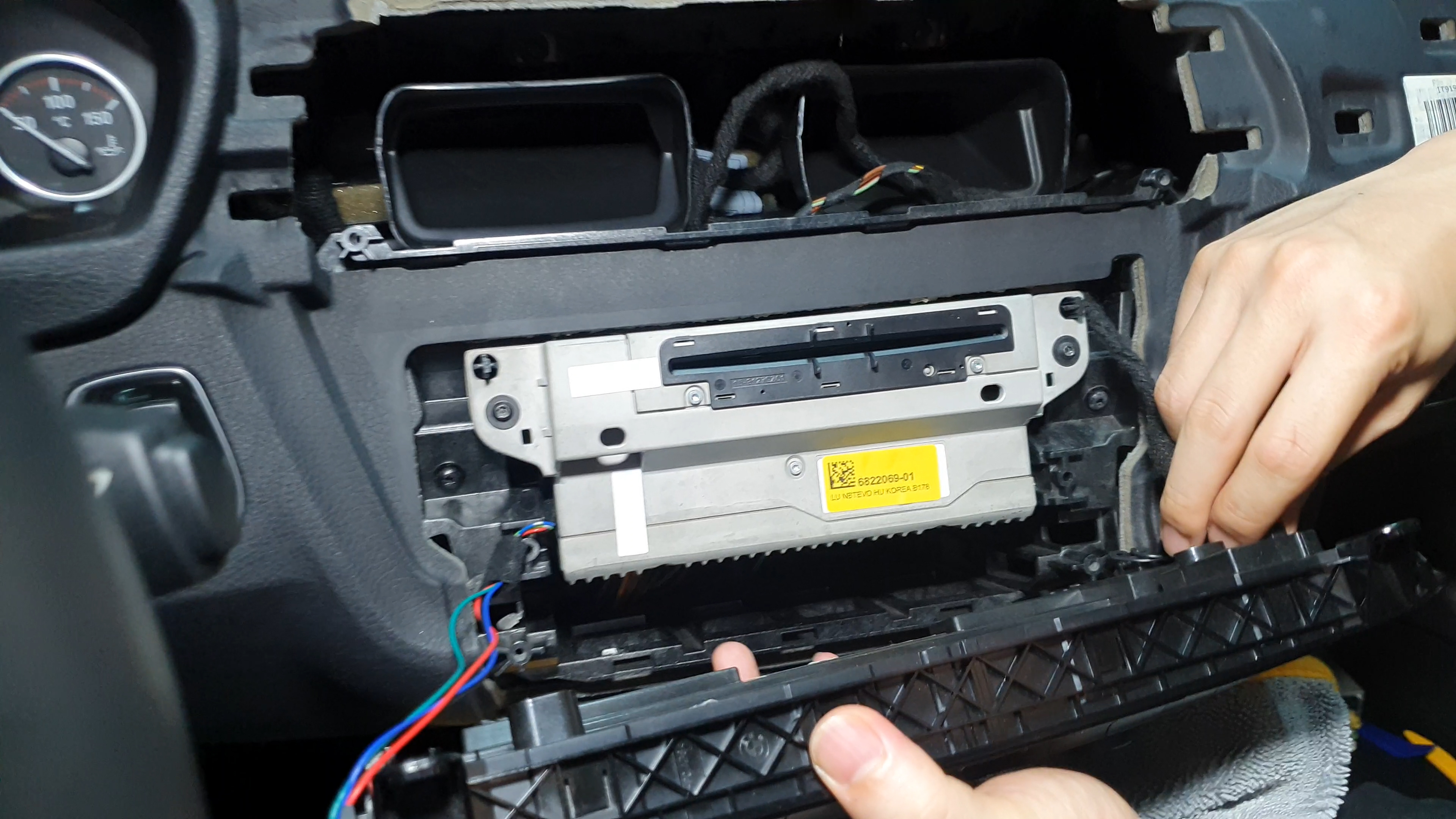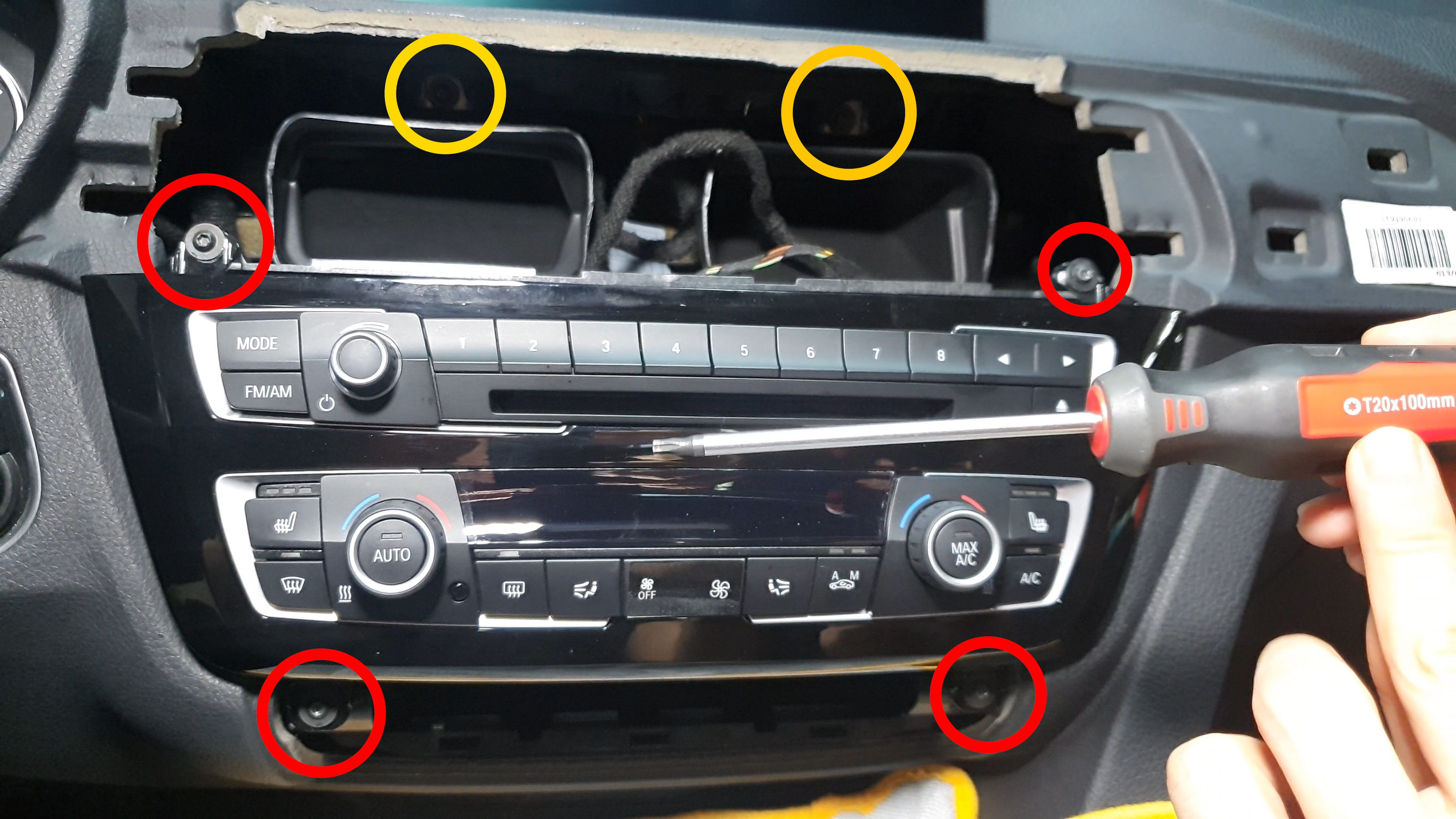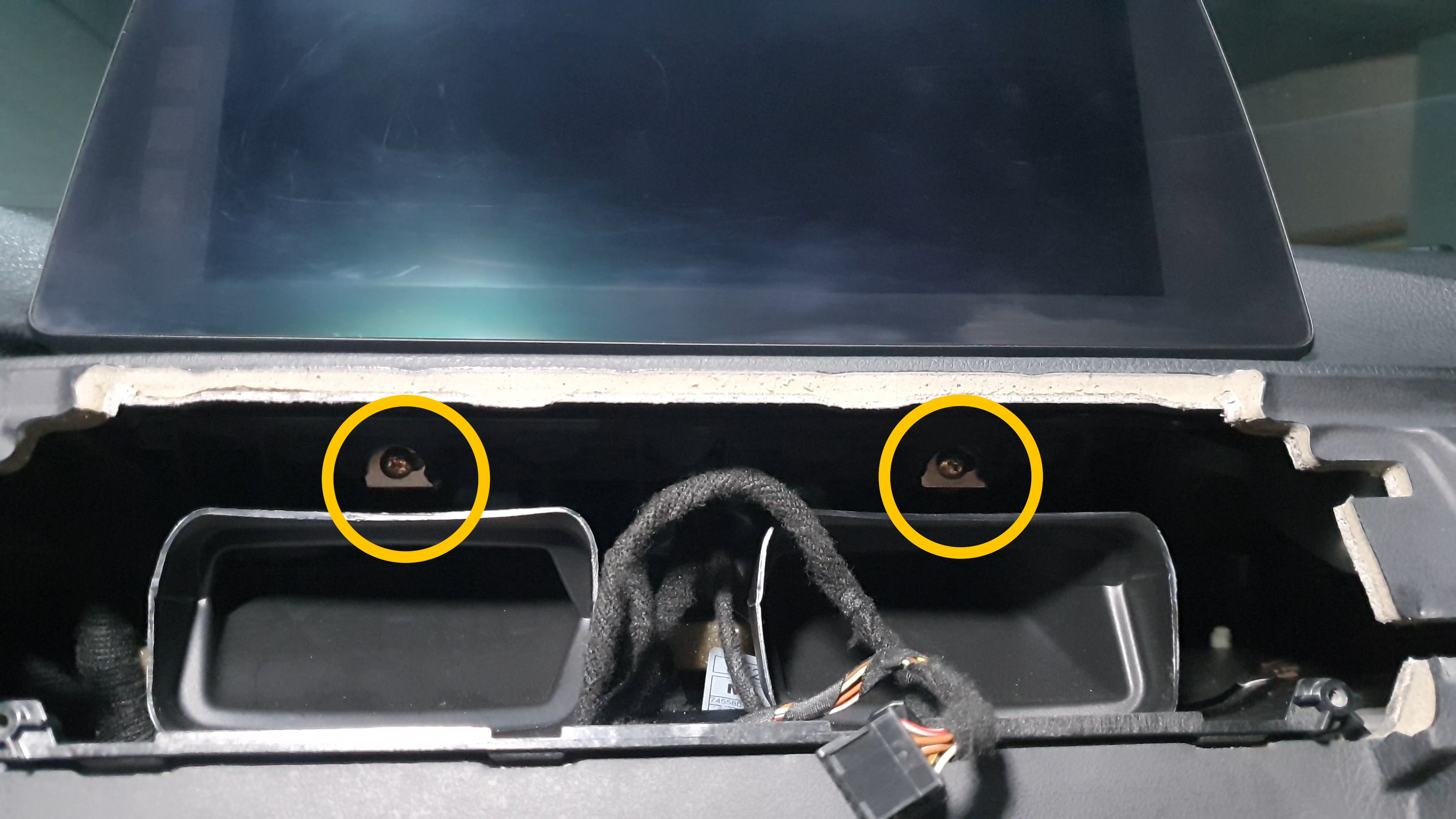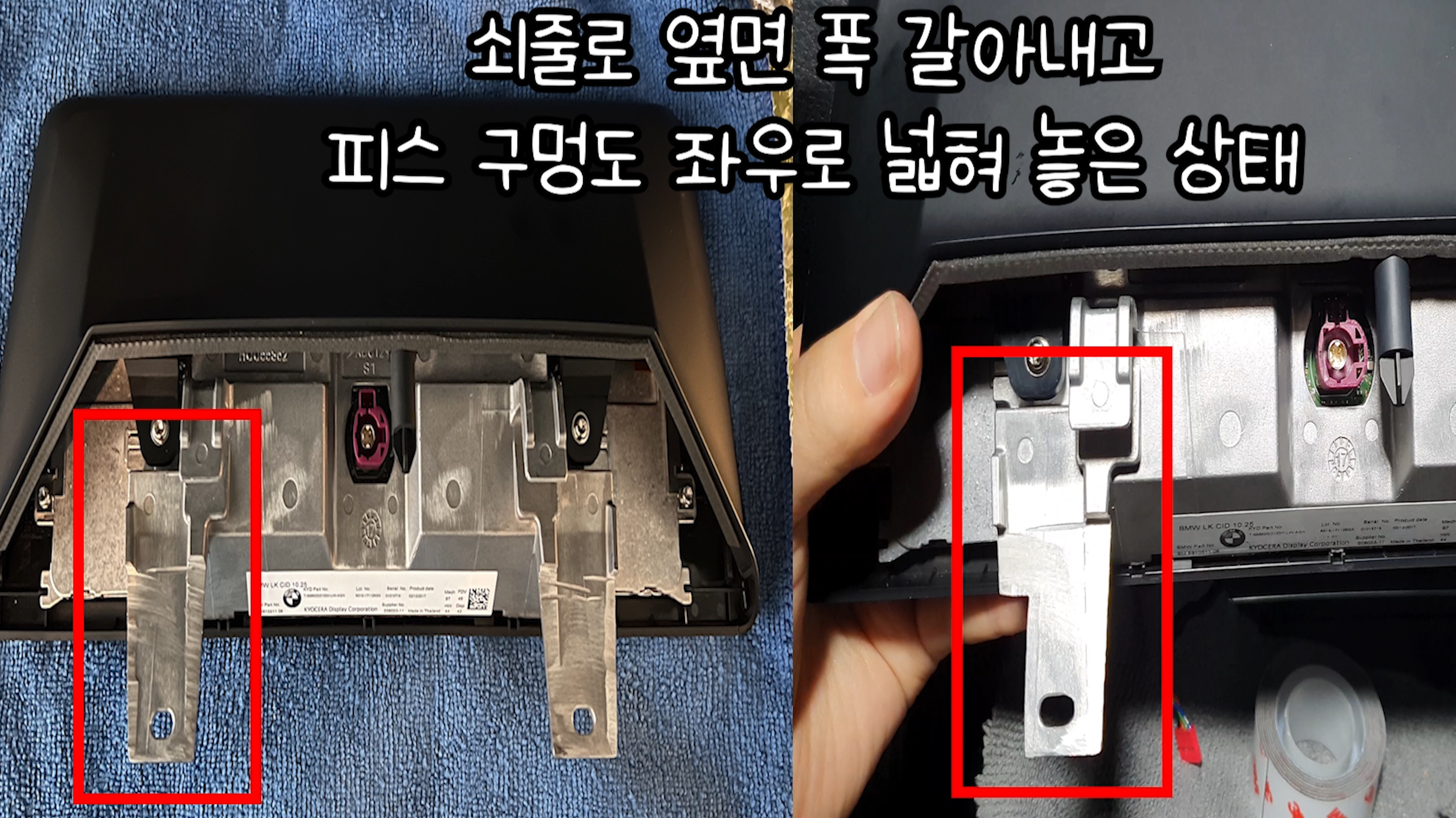 노란색 동그라미는 디스플레이 고정 피스 / 빨간색 동그라미는 오디오 공조패널 고정 피스