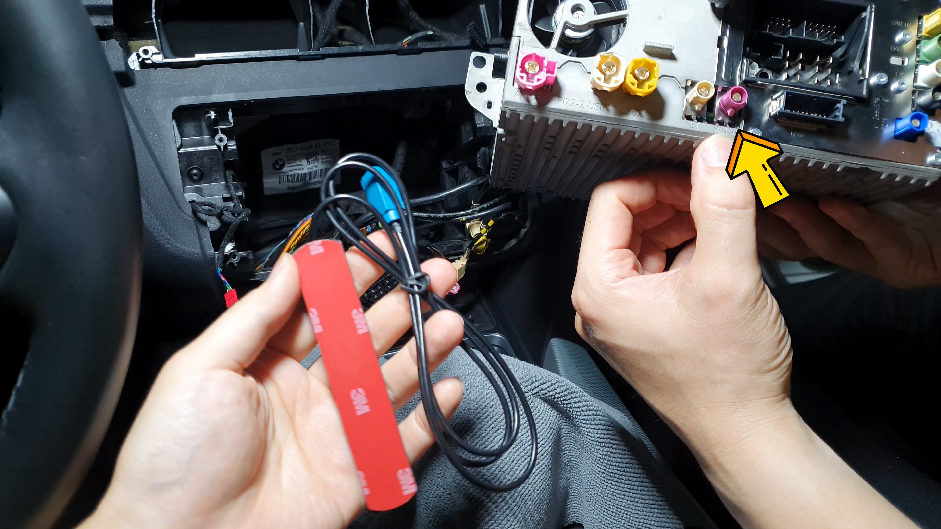 무선 카플레이를 위한 안테나. 화살표표시된 W LAN이라고 써져있는 포트에 꼽아줍니다