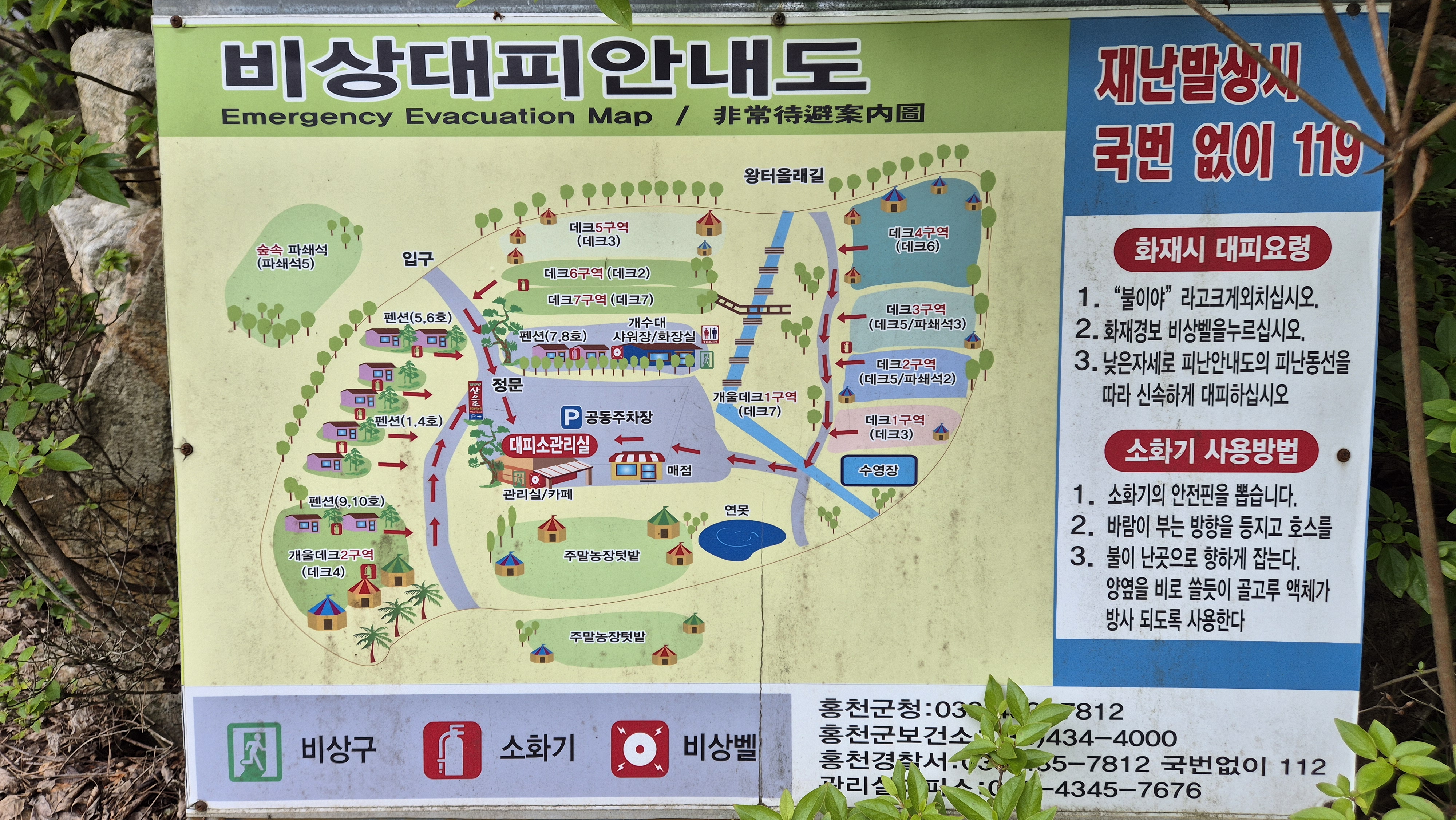 캠핑장의 전체적인 배치를 알 수 있는 비상대비안내도와 홈페이지에 있는 사이트 배치도 입니다