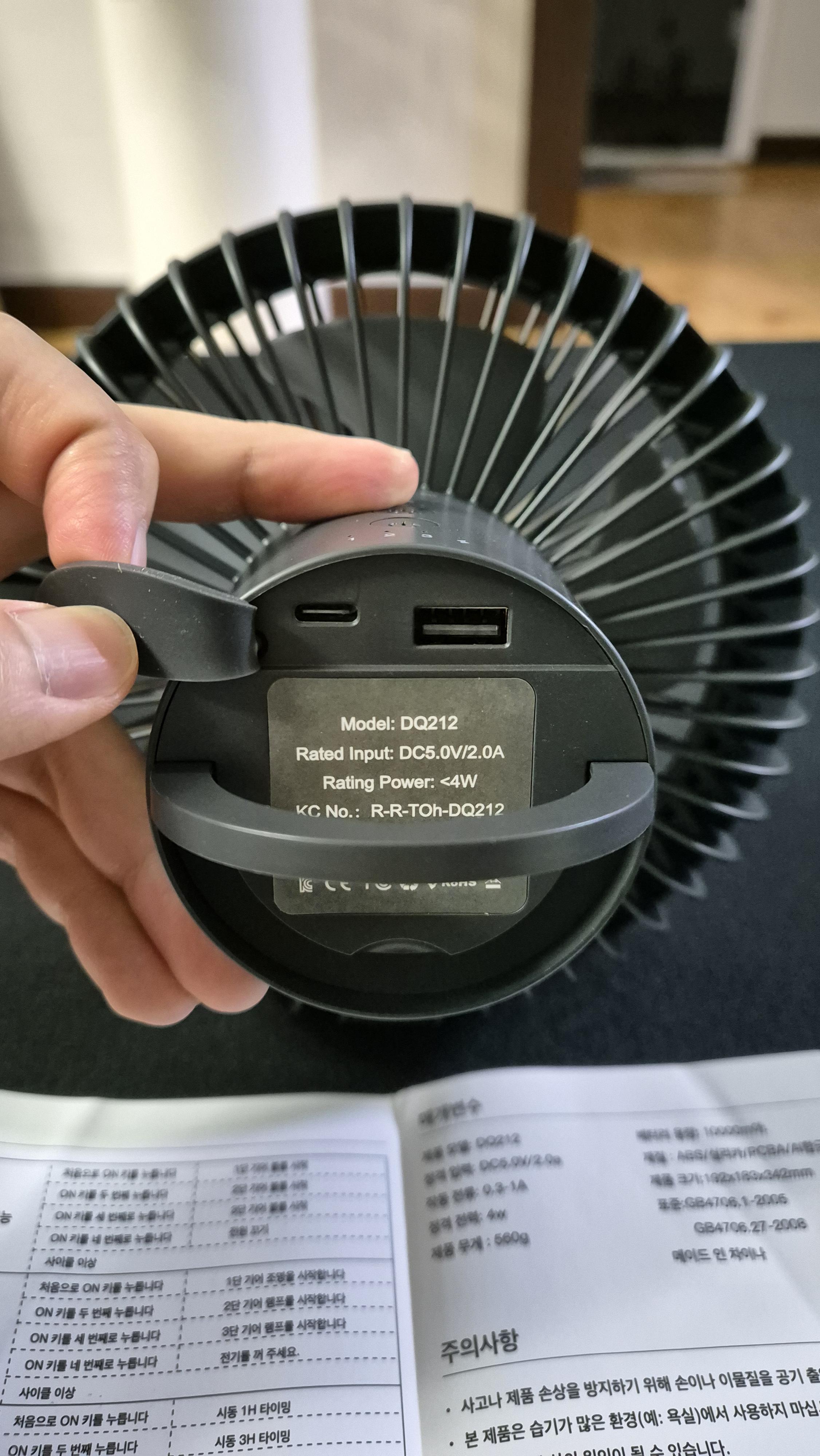풍량은 3단계로 조절이 가능하고 전원 입력은 C타입 / 출력은 A타입으로 가능합니다
