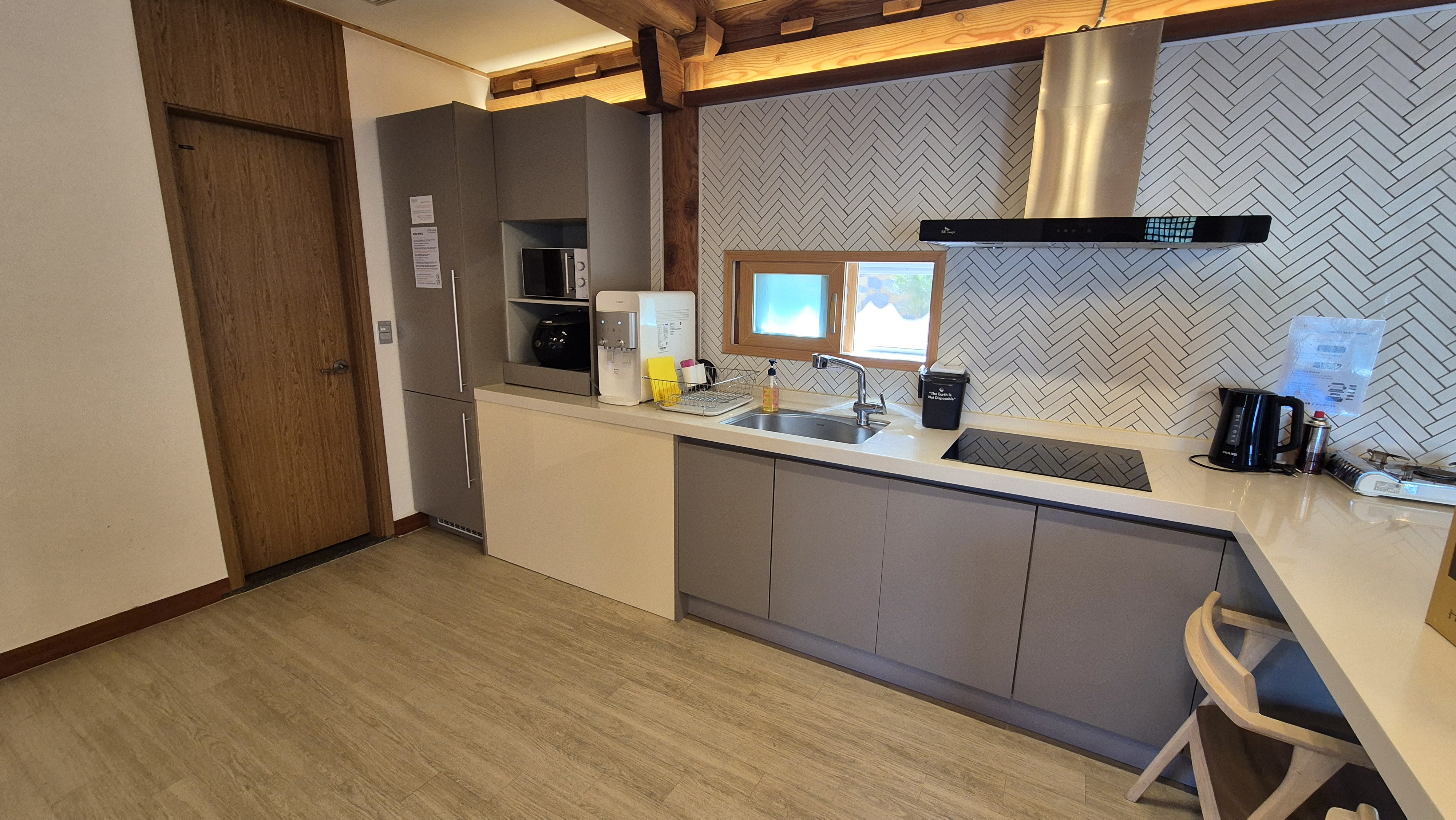 주방도 널찍널찍하고 정수기에 전자레인지 밥솥 인덕션 커피포트 버너까지