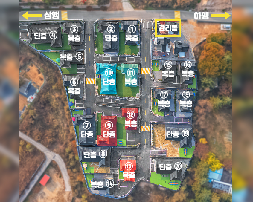 단층과 복층으로 이루어져있으며 20개의 한옥건물로 구성되어있습니다