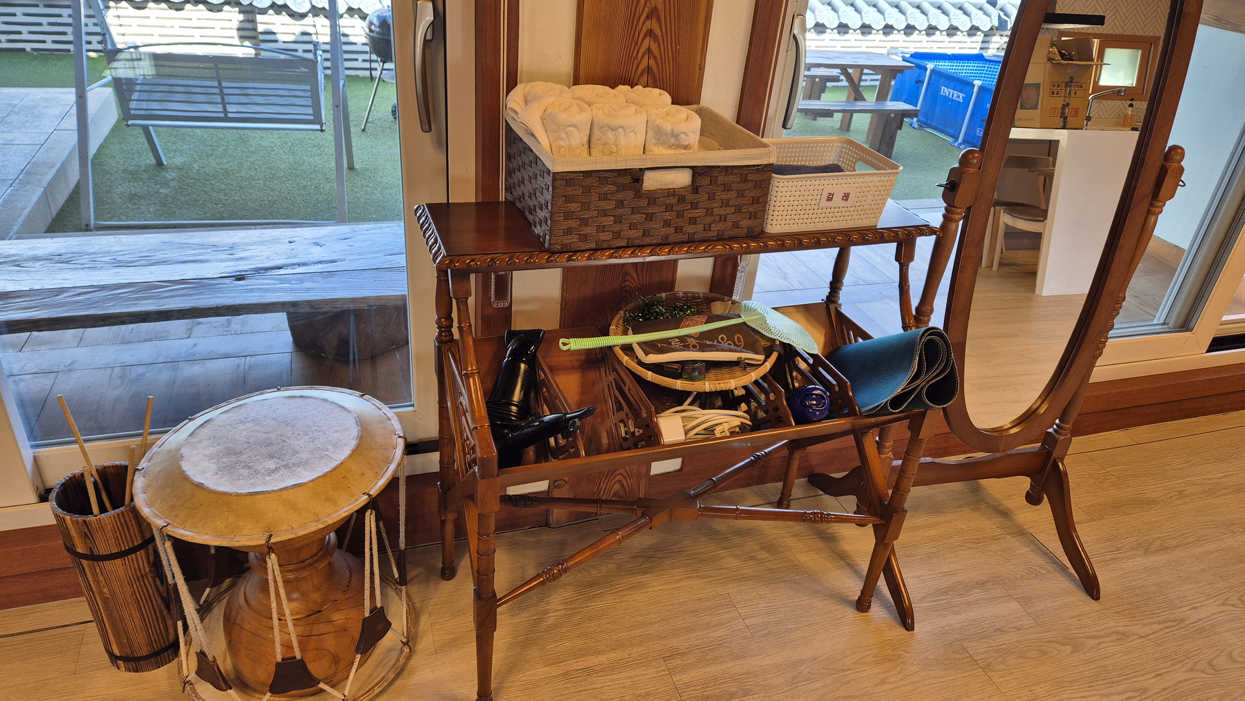 거실 한켠에는 한옥펜션의 컨셉에 맞게 장구나 투호 윷놀이 같은 놀이거리도 준비되어있었습니다