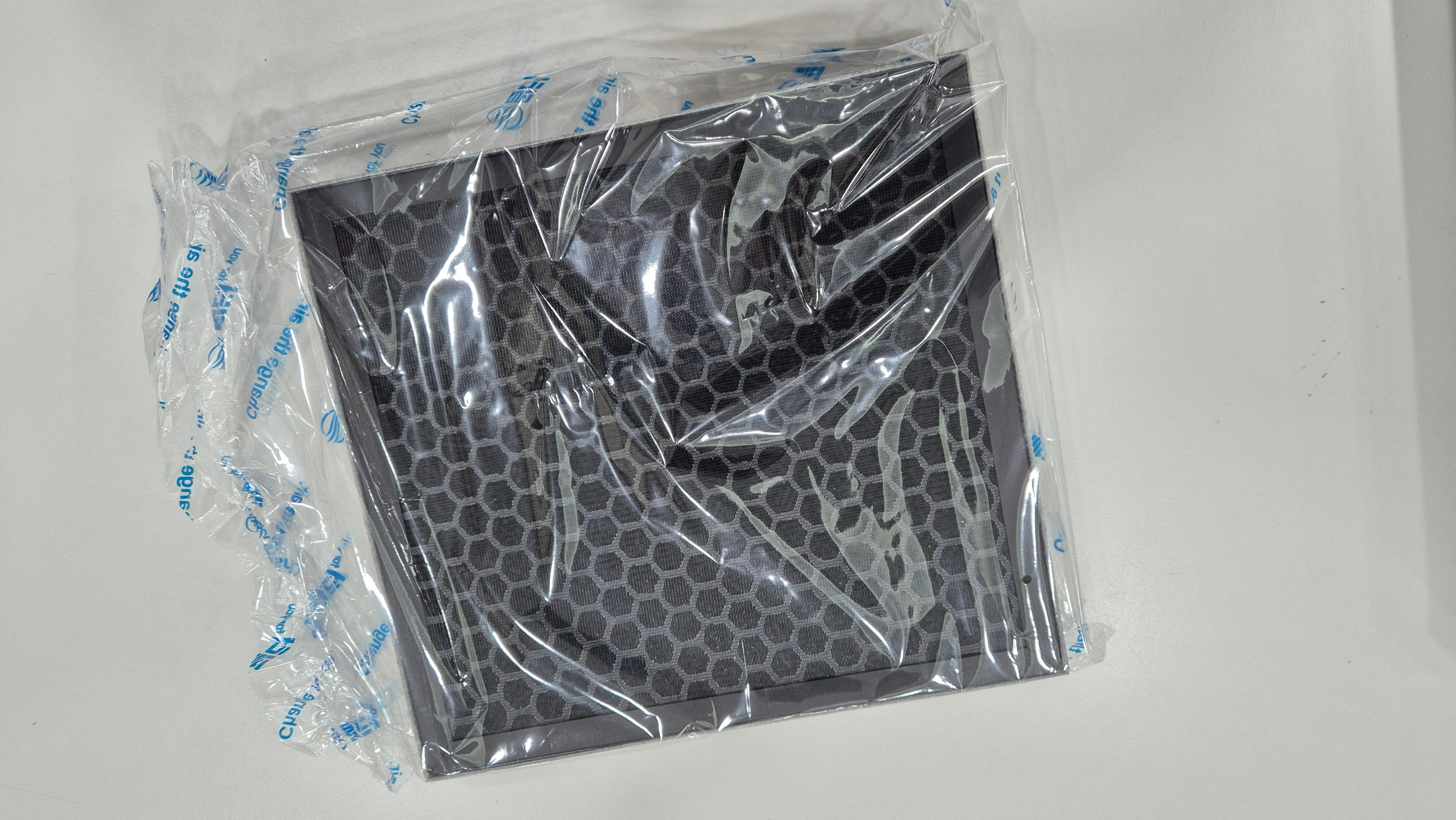 안을 열어서 구성품을 보면 보라색 멜트블로운 필터가 보이고 뒷면에는 벌집모양구조로 활성탄면이 보입니다