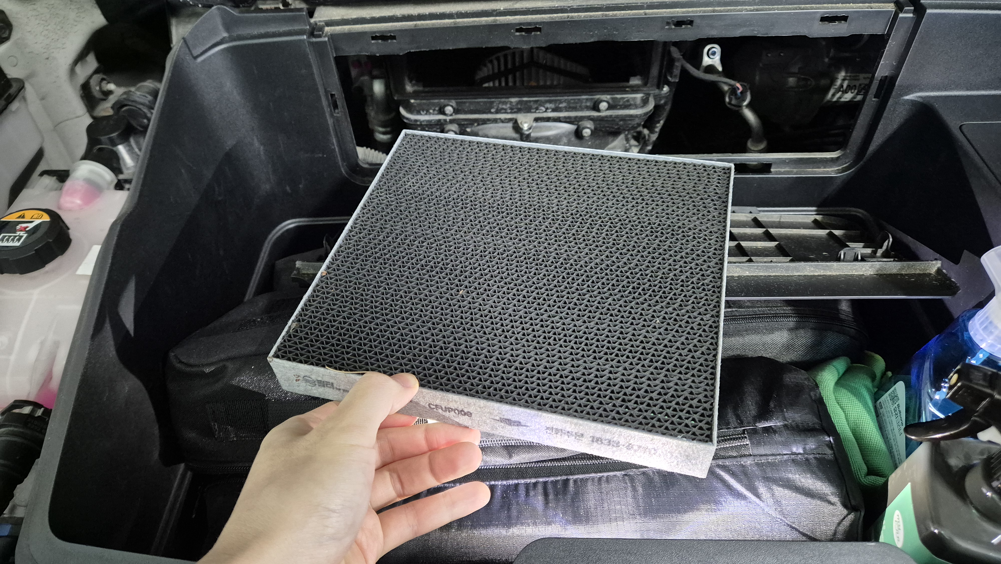 본넷을 열고 앞쪽 프렁크를 열면 안쪽에 필터를 교환할 수 있는 곳이 있습니다