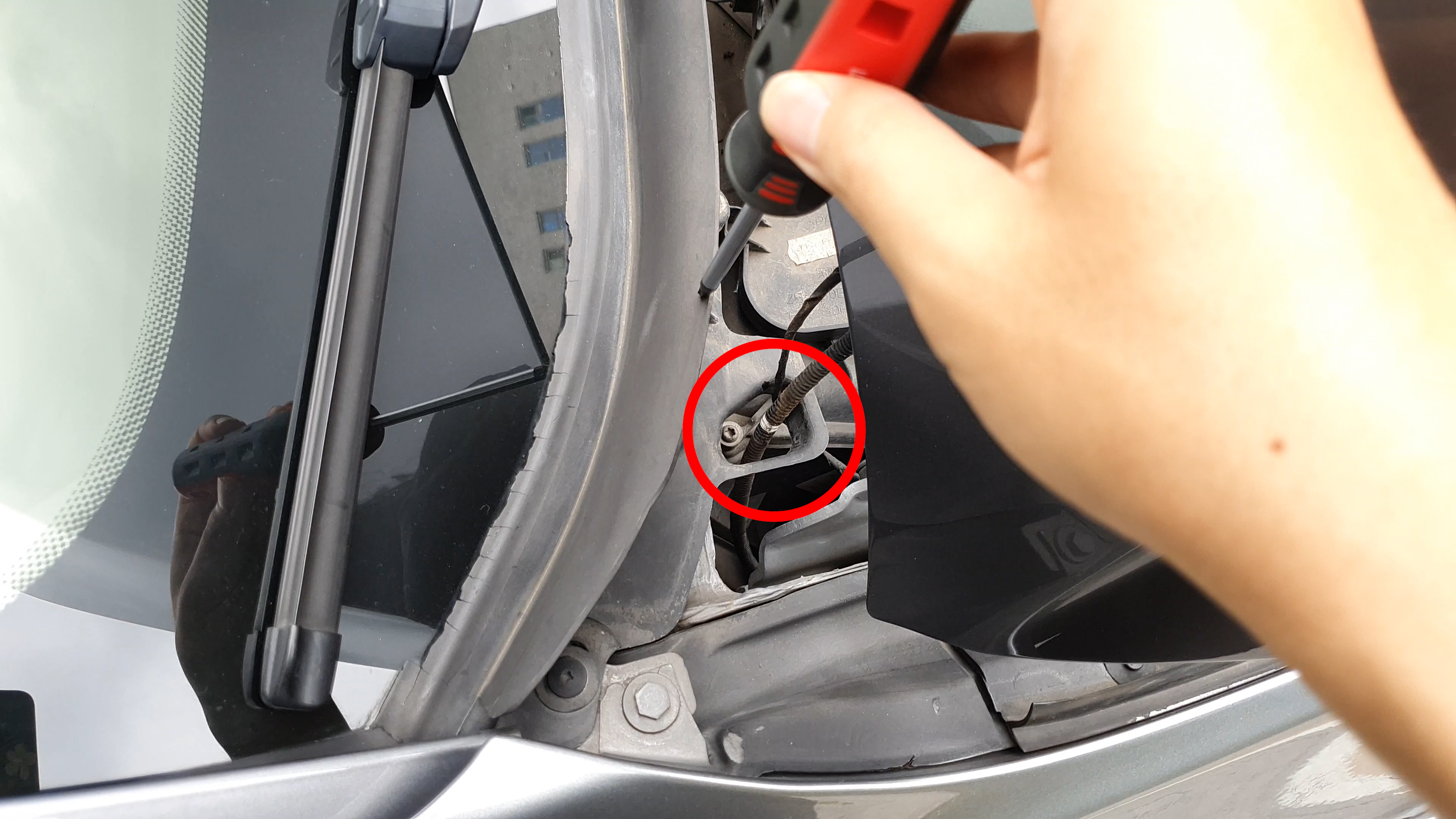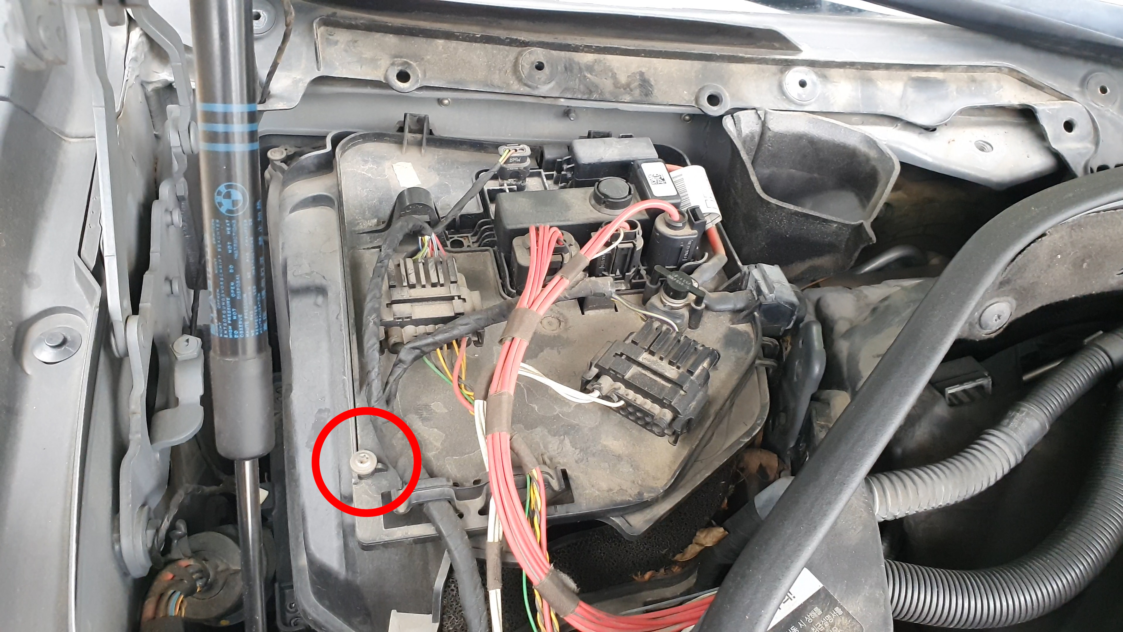 그러면 이제 본넷이 더 위로 올라가면서 빨간색 동그라미 부분으로 T25 공구를 넣어서 별모양 피스를 풀 수 있습니다