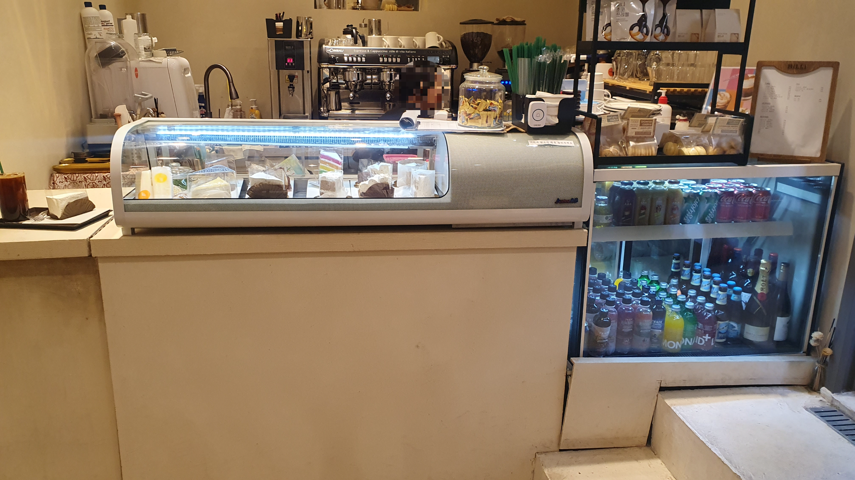 커피내리는 공간에는 진열장에 케이크가 있고 각종 음료가 있습니다ㅎ